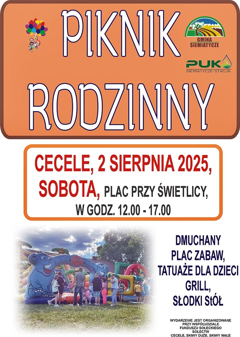 Także w sobotę, 2 sierpnia, na placu przy świetlicy w Cecelach (gmina Siemiatycze) odbędzie się Piknik Rodzinny. Początek o godz. 12.00. Jak co roku – atrakcje dla najmłodszych to dmuchany plac zabaw, słodkości i tatuaże.