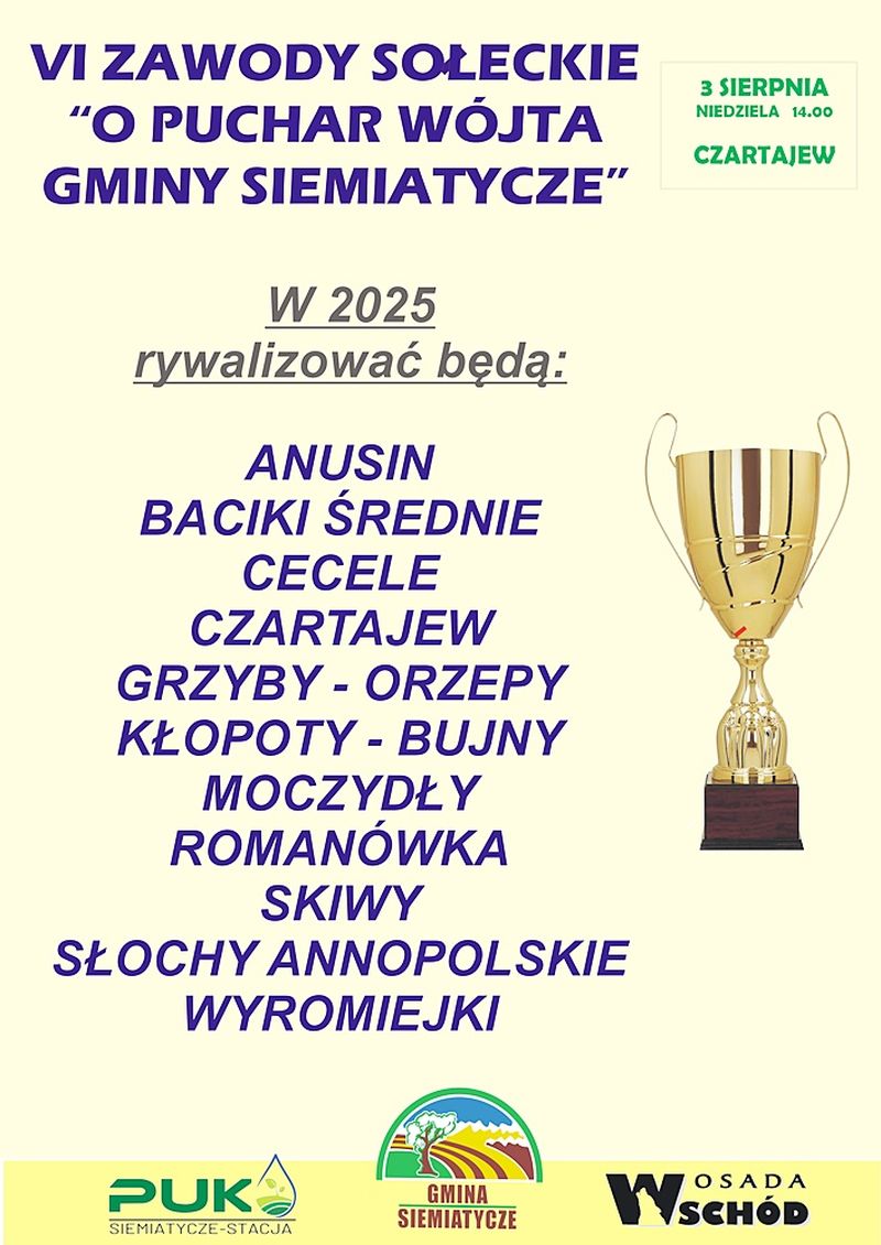 W niedzielę, 3 sierpnia, 11 drużyn weźmie udział w VI Zawodach Sołeckich „O Puchar Wójta Gminy Siemiatycze”. Zawody zaplanowano w Czartajewie. Istnieje możliwość zmiany miejsca wydarzenia (jak informuje Gmina Siemiatycze – boisko trawiaste przy szkole w Czartajewie, czyli główna arena planowanych zmagań, jest zbyt nasiąknięte wodą). W przypadku niekorzystnych warunków atmosferycznych zawody zostaną przełożone.