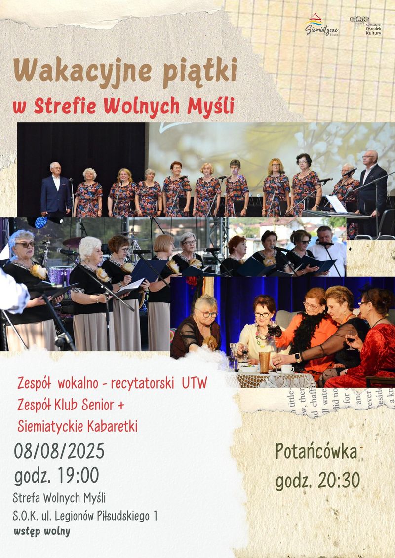 W piątek, 8 sierpnia o godz. 19:00, w cyklu „Wakacyjne Piątki w Strefie Wolnych Myśli” w parku przy Siemiatyckim Ośrodku Kultury (ul. Legionów Piłsudskiego 1) wystąpią: