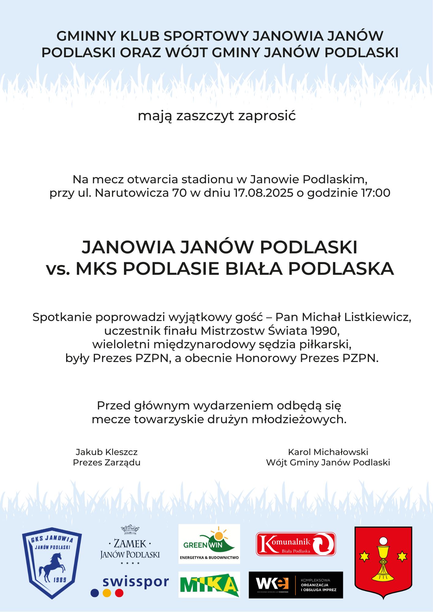 Wójt Gminy Janów Podlaski Karol Michałowski zaprasza mieszkańców i gości na dwa wyjątkowe wydarzenia z udziałem Michała Listkiewicza – byłego Prezesa Polskiego Związku Piłki Nożnej oraz jednego z najbardziej rozpoznawalnych sędziów piłkarskich w historii polskiego sportu.
