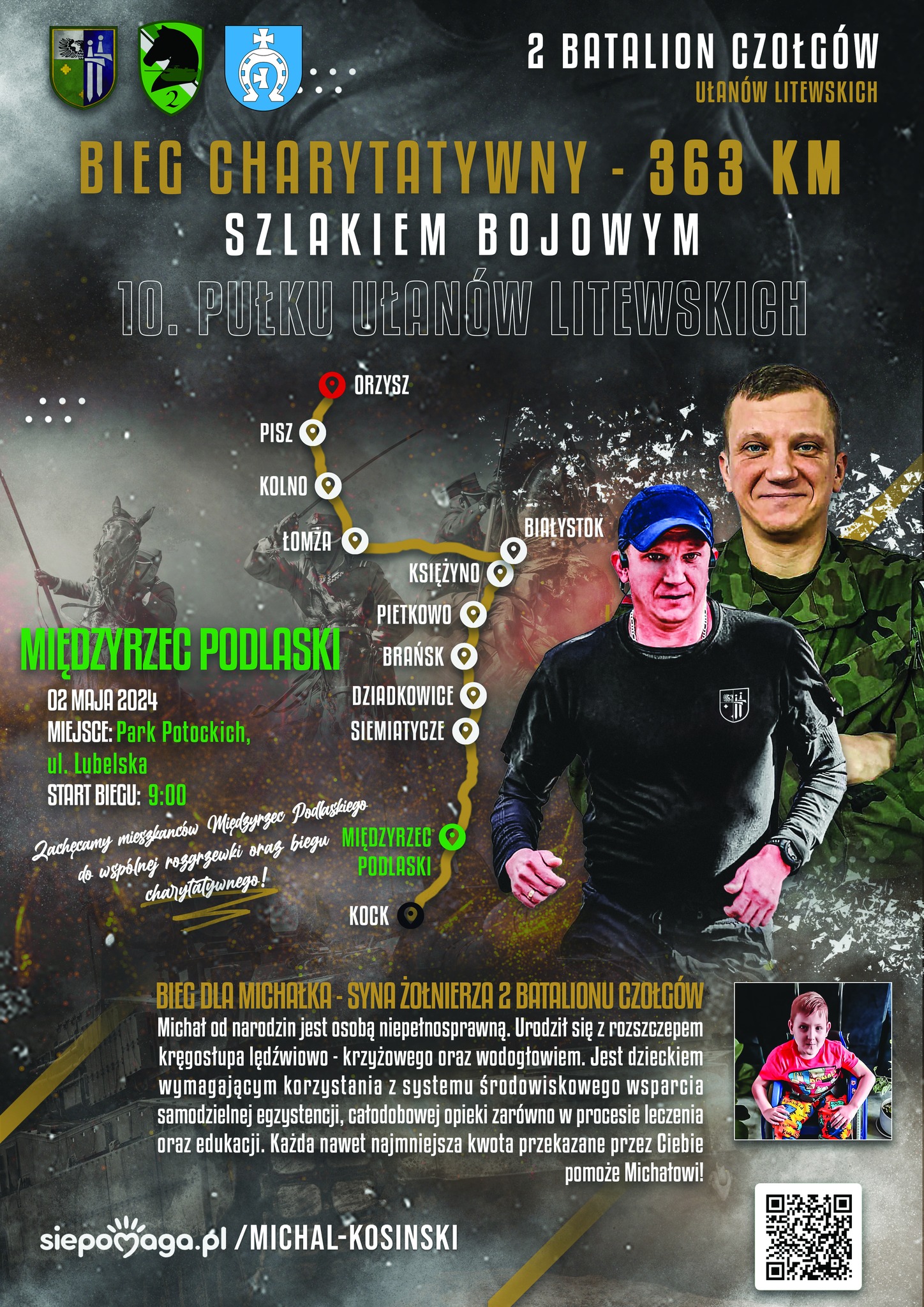 1 maja do Międzyrzeca Podlaskiego przybiegnie Dawid Wasilewski, który podjął wyzwanie dla chorego Michałka Kosińskiego. Wyzwanie polega na pokonaniu 363 km „Szlakiem Bojowym 10. Pułku Ułanów Litewskich” z Kocka do Orzysza.