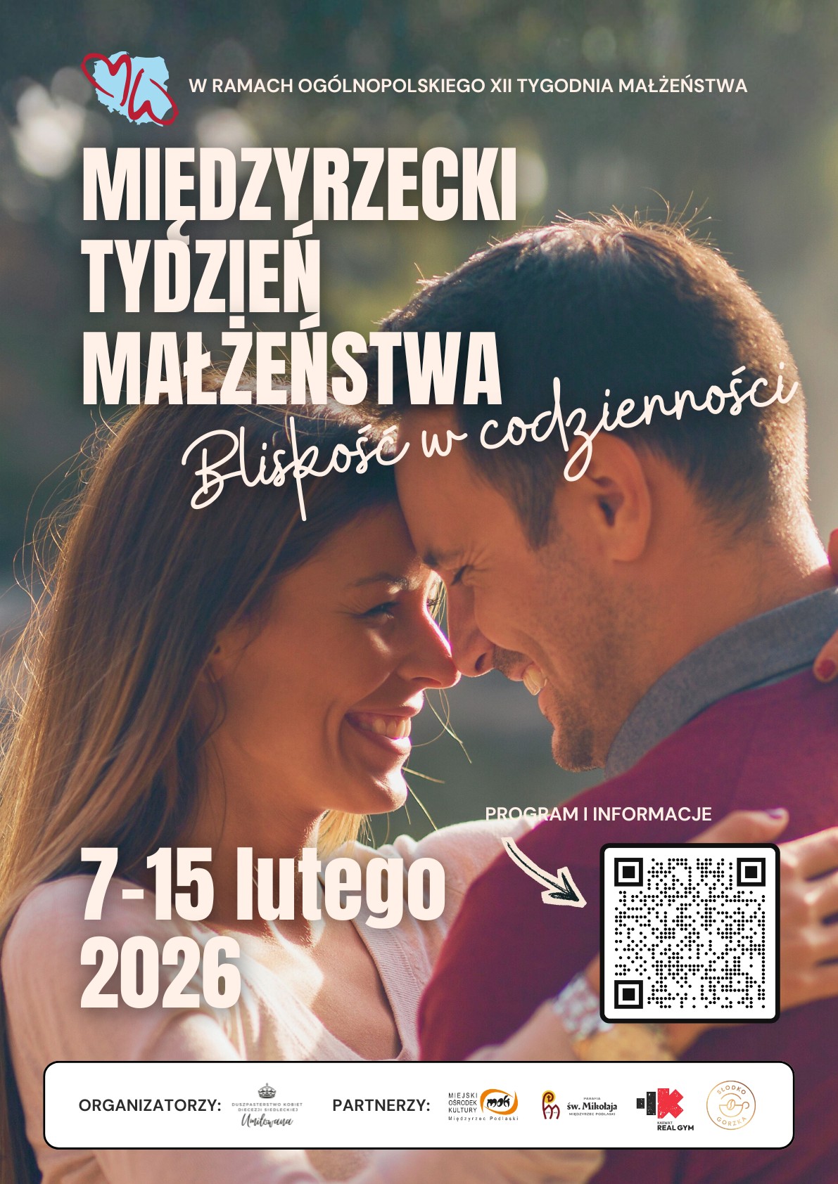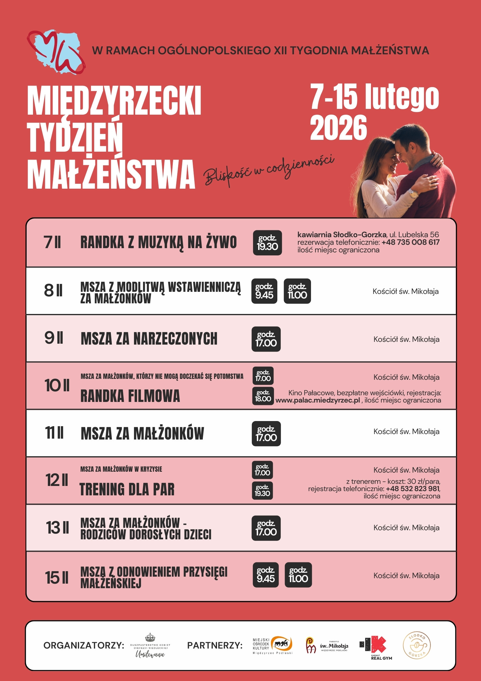 Większość wydarzeń ma charakter otwarty, jednak na randkę z muzyką, seans filmowy oraz trening obowiązują wcześniejsze zapisy (liczba miejsc jest ograniczona). Szczegóły dotyczące rejestracji oraz numery telefonów kontaktowych dostępne są na stronie www.tydzienmalzenstwa.pl/miedzyrzec-podlaski-2026
