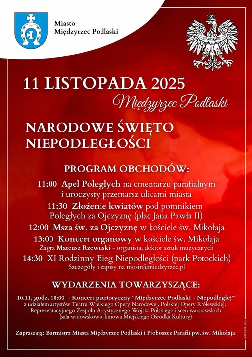 Główne uroczystości Narodowego Święta Niepodległości na Ziemi Międzyrzeckiej odbędą się 11 listopada w Międzyrzecu Podlaskim. Rozpoczną się o godzinie 11:00 Apelem Poległych na cmentarzu parafialnym. Następnie zostaną złożone kwiaty pod Pomnikiem Poległych za Ojczyznę na Placu Jana Pawła II.