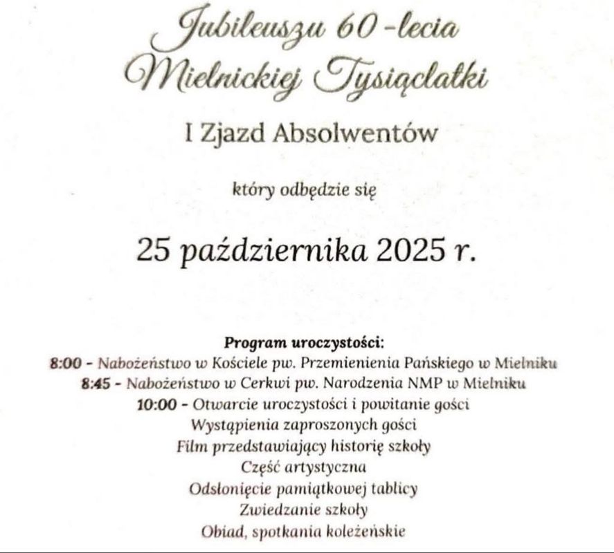 Główne uroczystości jubileuszu 60-lecia Mielnickiej Tysiąclatki połączone z pierwszym Zjazdem Absolwentów odbędą się w Mielniku w sobotę, 25 października. Będzie to nie tylko okazja do wspomnień i spotkań po latach, ale również wyraz uznania dla historii i dorobku placówki, która od sześciu dekad kształtuje kolejne pokolenia mieszkańców gminy Mielnik.Uroczystości rozpoczną się o godzinie 8:00 mszą świętą w kościele pw. Przemienienia Pańskiego w Mielniku. O 8:45 odbędzie się nabożeństwo w Cerkwi pw. Narodzenia NMP. Oficjalne rozpoczęcie jubileuszu w Zespole Szkół im. Unii Mielnickiej w Mielniku zaplanowano na godzinę 10:00. Nastąpi wówczas otwarcie uroczystości i powitanie gości.