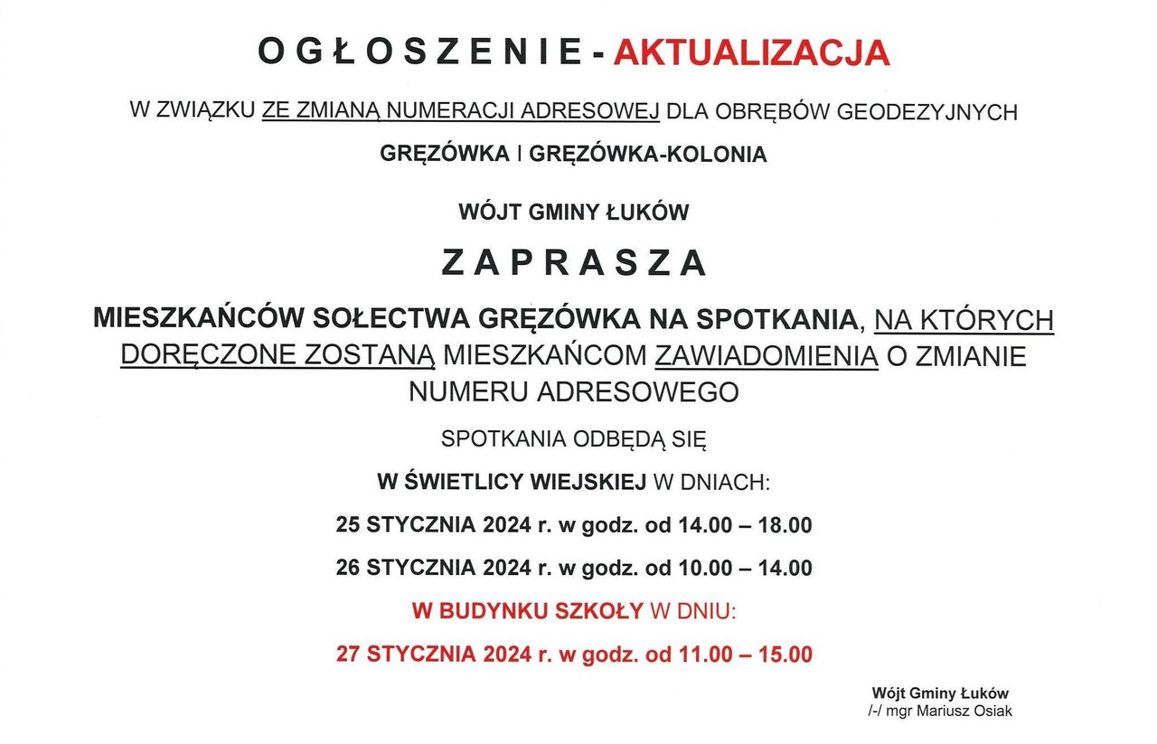 Mieszkańcy Gręzówki, nowej miejscowości w gminie Łuków, która powstała 1 stycznia z połączenia Gręzówki, Nowej Gręzówki i Gręzówki Kolonia, muszą zmienić adresy zamieszkania. Zawiadomienia o nowych numerach adresowych otrzymają na spotkaniach, które odbędą się 25, 26 i 27 stycznia.