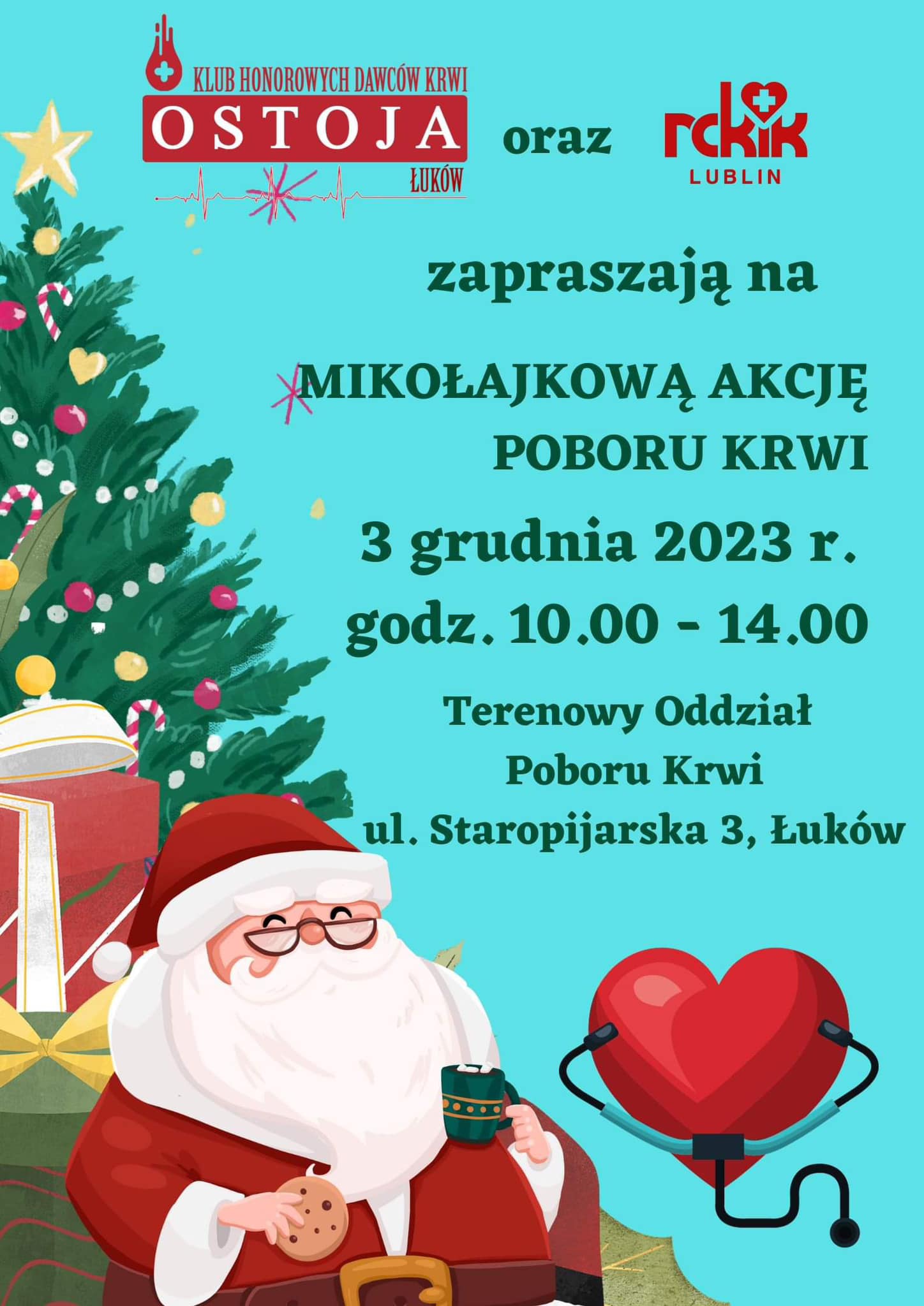 W niedzielę, 3 grudnia odbędzie się Mikołajkowa akcja poboru krwi zorganizowana przez łukowski Klub Honorowych Dawców Krwi „Ostoja”. Do akcji będzie można przyłączyć się w Terenowym Oddziale Poboru Krwi przy Staropijarskiej 3 w Łukowie.