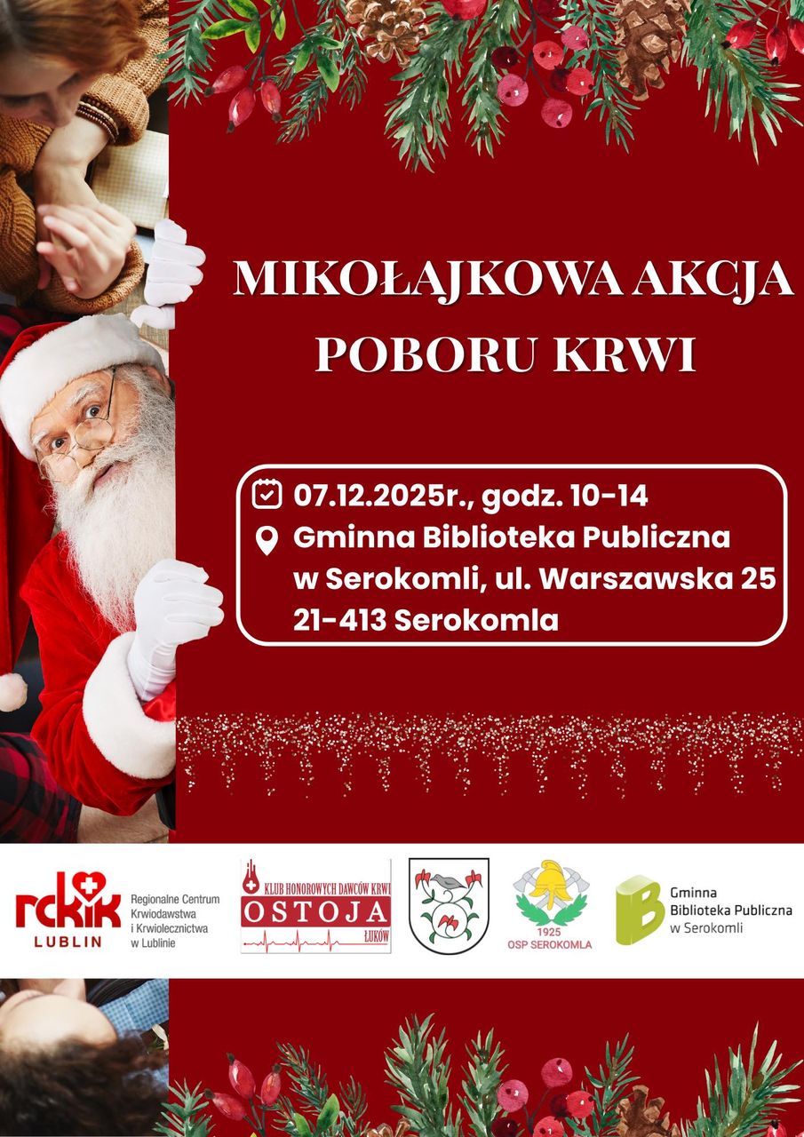 Mikołajkową Akcję Poboru Krwi organizują wspólnie Regionalne Centrum Krwiodawstwa i Krwiolecznictwa w Lublinie oraz łukowski klub Honorowych dawców Krwi „Ostoja”. Partnerami wydarzania są Gminna Biblioteka Publiczna w Serokomli, Urząd Gminy oraz druhowie strażacy z Serokomli. Ambulans, w którym będzie oddawana krew, stanie przy budynku biblioteki.Krew mogą oddać osoby, które mają od 18 do 65 lat i ważą co najmniej 50 kilogramów. W dniu oddania krwi należy być wyspanym i wypoczętym oraz zdrowym, czyli nie mieć objawów przeziębienia i nie brać aktualnie żadnych leków. Trzeba zjeść lekki, niskotłuszczowy posiłek, a w ciągu doby przed pobraniem wypić około 2 litrów płynów. Przychodząc na akcję trzeba wziąć ze sobą dokument tożsamości ze zdjęciem, najlepiej dowód osobisty.