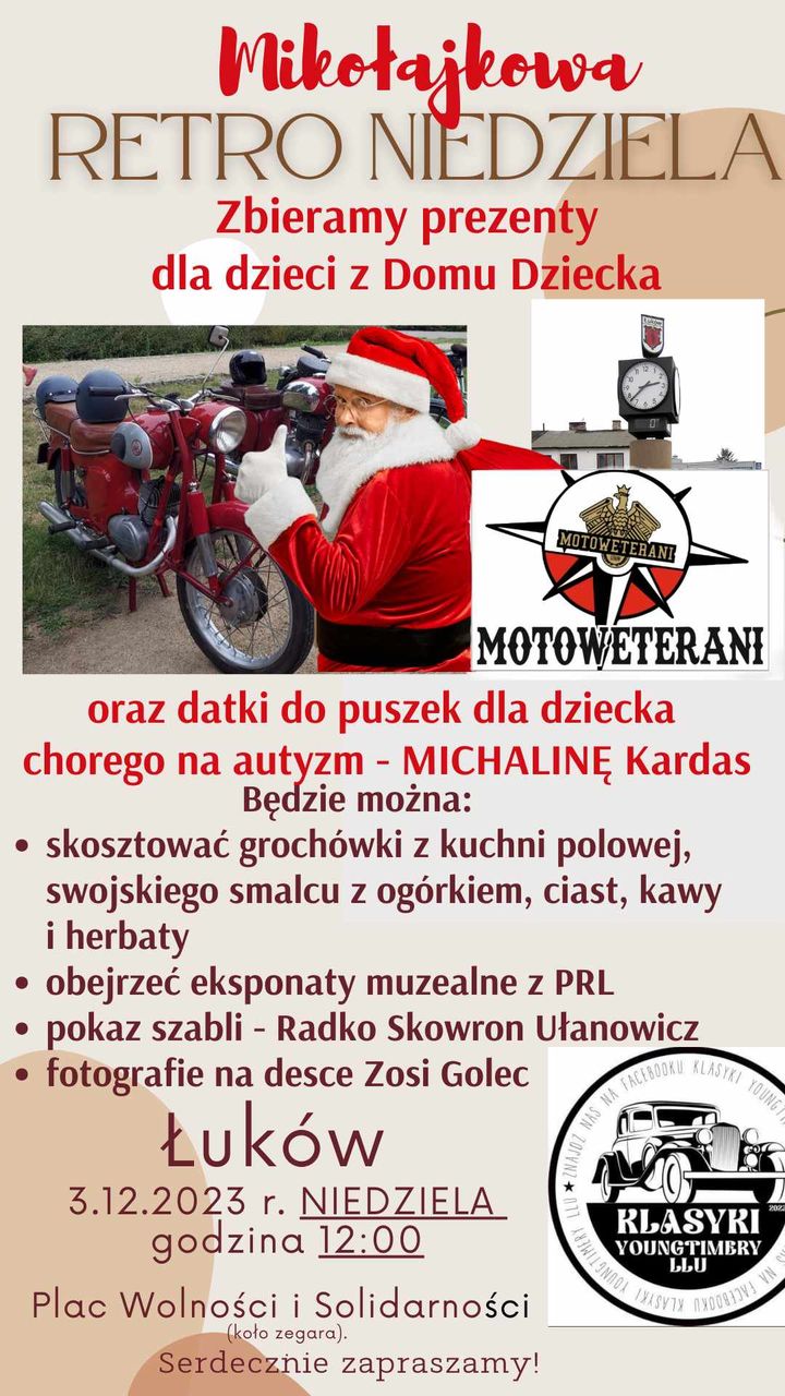 Przed nami pierwsza niedziela nowego miesiąca, a to oznacza, że w Łukowie odbędzie się kolejna odsłona Retro Niedzieli, czyli Spotkania Klasycznej Motoryzacji. Miejscem tego spotkania będzie Plac Solidarności Wolności. Początek o godzinie 12.00. Na wszystkich czekać będą wyjątkowe motocykle i auta oraz pokaz szabli i pokaz fotografii na desce Zofii Golec.Podczas Mikołajkowej Retro Niedzieli odbędzie się również zbiórka prezentów dla domów dziecka oraz zbiórka funduszy dla Michalinki Kardas.