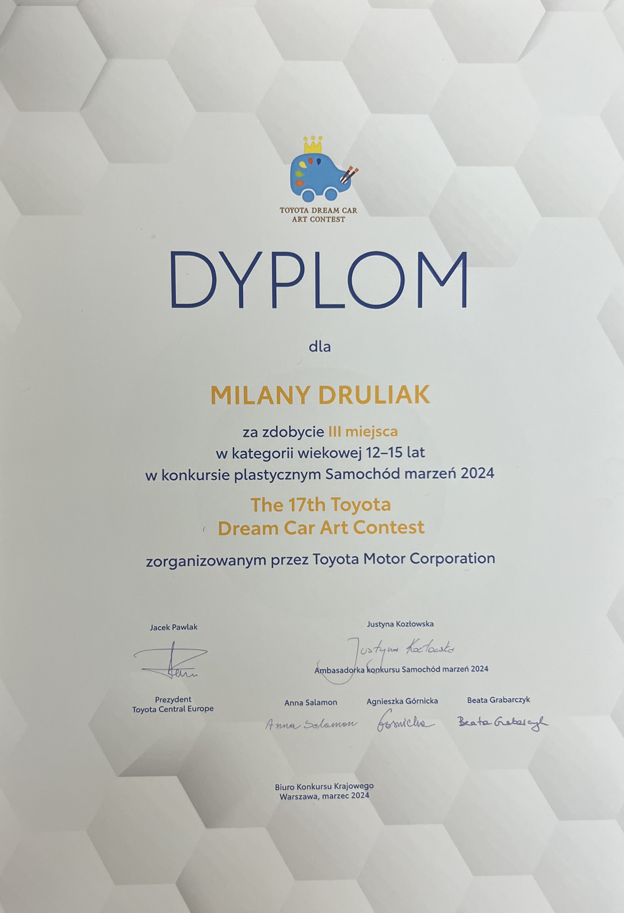 Milana zajęła III miejsce w pierwszym etapie konkursu. Teraz jej praca powalczy o główną nagrodę w Japonii, w siedzibie organizatora konkursu marki Toyota. Ubiegać się będą o nią dzieci z ponad 80. krajów świataMilana jest kolejną podopieczną Tatyany Luchny, która odniosła sukces w tym konkursie. W poprzednich latach były to 2021 rok - Joanna Witowska - III miejsce „samochód Sowkolot Snów”, 2020 rok - Vlada Vlasenko - I miejsce „samochód Australia 2020”, 2018 rok - Julia Hołownia - III miejsce „samochód Serowa Fantazja" oraz wyróżnienie Vlada Vlasenko.