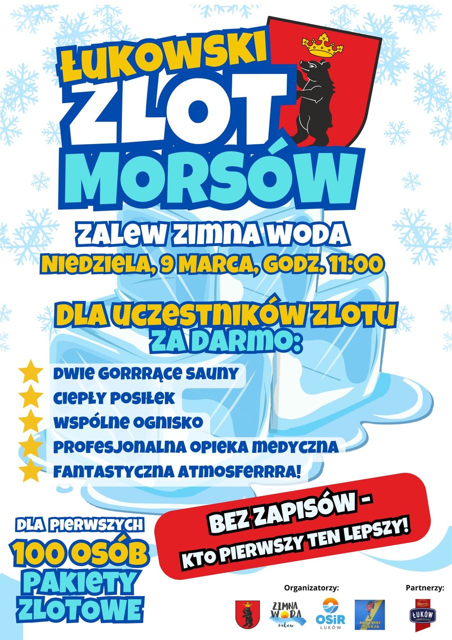 Łukowski Zlot Morsów nad zalewem Zimna Woda zaplanowano na niedzielę 9 marca. Wszystko zacznie się o godzinie 11.00. Na morsów czekać będą dwie gorące sauny, ciepły posiłek, wspólne ognisko, profesjonalna opieka medyczna oraz fantastyczna atmosfera. Nie ma zapisów. Każdy może przyjść, kto chce zażyć zimnej kąpieli. Ale dla pierwszych stu osób przewidziano pakiety zlotowe.