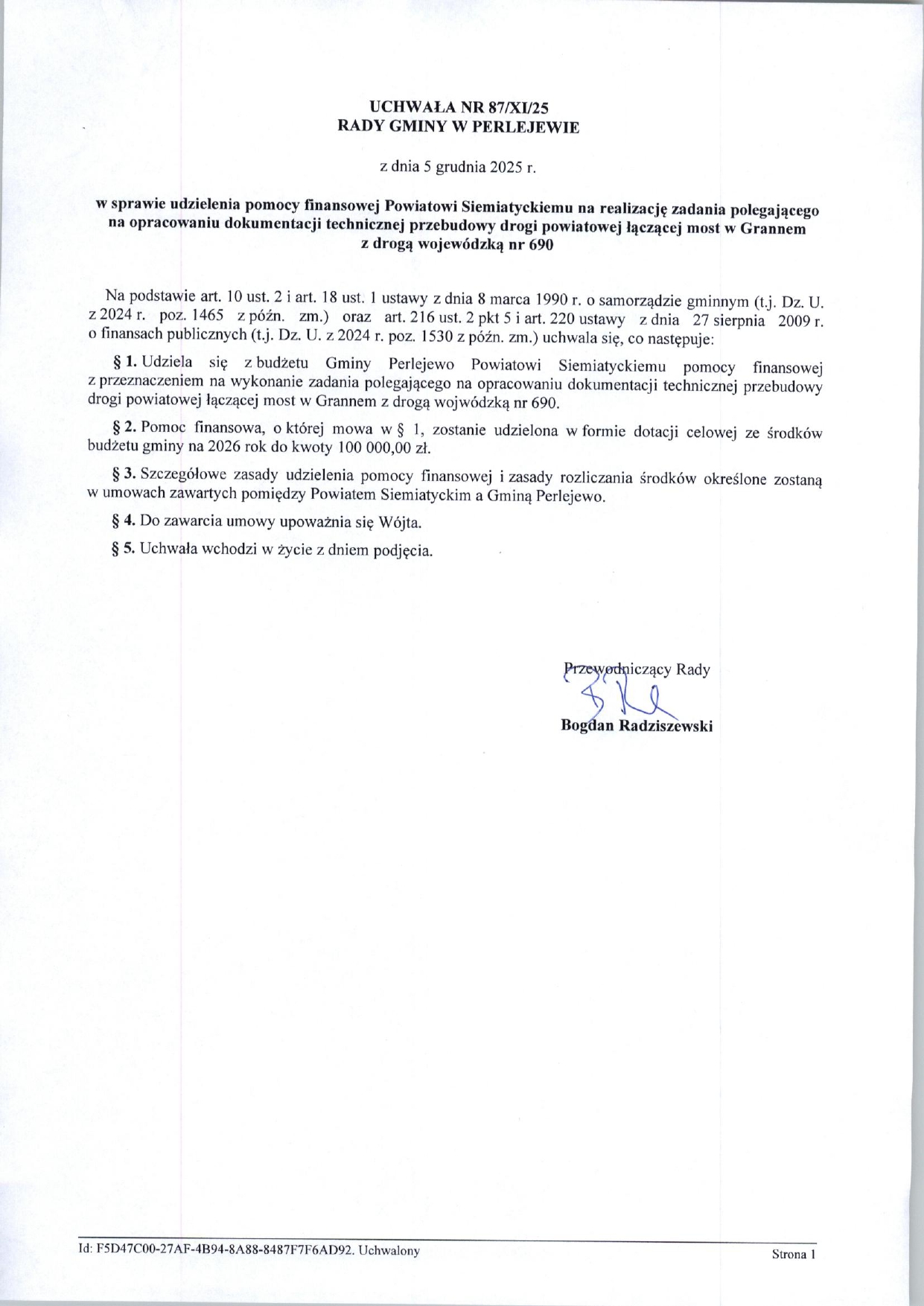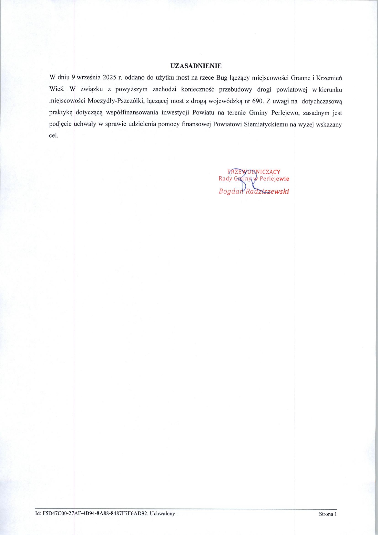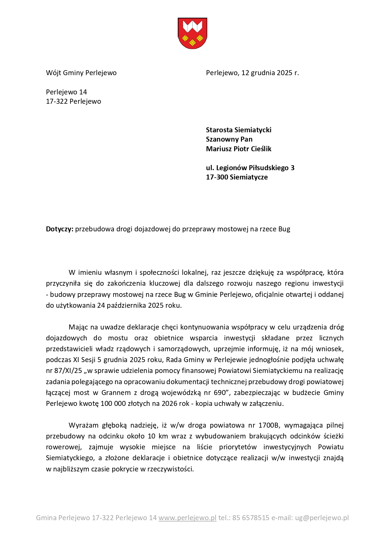 Potrzebne są odpowiedniej jakości drogi do nowo wybudowanego mostu na rzece Bug: Granne – Krzemień Wieś, przypomina Jakub Krzysztof Wierzbicki, wójt gminy Perlejewo. Most wspólnie budowały samorządy różnych szczebli, wspólnie wiec też należy zadbać o drogi, podkreśla wójt i informuje, że gmina Perlejewo zrobiła już pierwszy krok. W przyszłorocznym budżecie zabezpieczono już środki na wkład własny w przygotowanie dokumentacji projektowej.