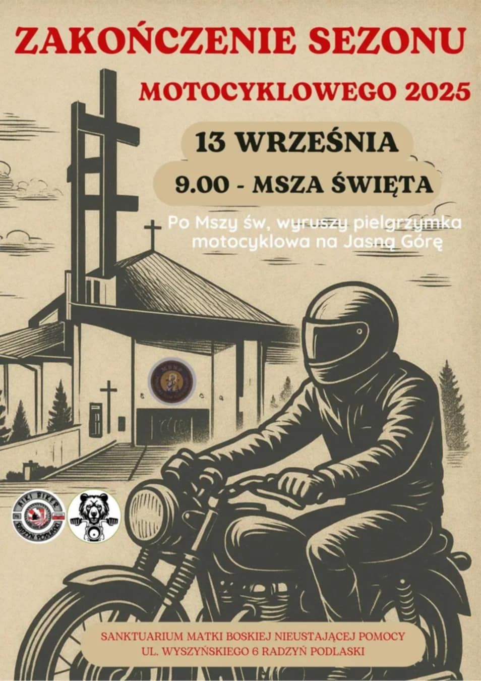 Zakończenie sezonu motocyklowego 2025 organizują Aiki Baiker FG z Radzynia Podlaskiego i Gray Bears. W wydarzeniu weźmie udział liczna ekipa Motoweteranów Łuków. O godzinie 9.00 motocykliści wezmą udział w Mszy Świętej, która odprawiona zostanie w Sanktuarium Matki Boskiej Nieustającej Pomocy w Radzyniu Podlaskim. Motocykliści będą dziękować za bezpieczny sezon i opiekę w drodze. Po wspólnej modlitwie wszyscy wyruszą na Motocyklową Pielgrzymkę na Jasną Górę, tworząc wspólny rajd.Celem wydarzenia jest zakończenie sezonu w duchowej atmosferze, podziękowanie za przejechane kilometry, przeżycia i wszystkie doświadczenia, które motocykliści zdobyli w mijającym sezonie, oraz wspólna podróż do Częstochowy – informują organizatorzy.