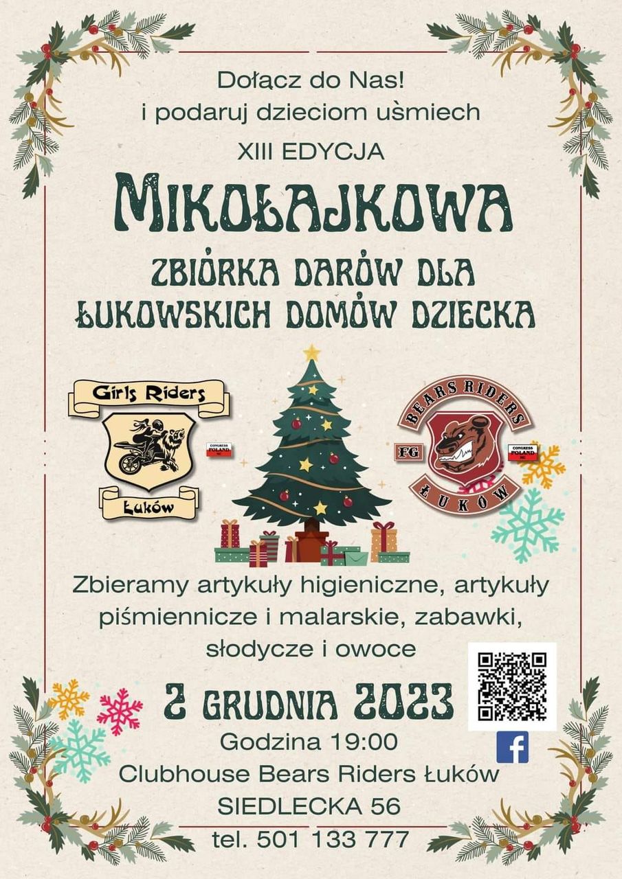 Podczas mikołajkowej akcji zbierane będą zabawki, słodycze, owoce, artykuły piśmiennicze (bloki, kredki, mazaki, farby itp.) oraz środki higieniczne (żele pod prysznic itp.). To właśnie te przedmioty trafią następnie w mikołajki 6 grudnia do podopiecznych Domu Dziecka oraz Domu Pomocy Społecznej w Łukowie.Finał zbiórki odbędzie się 2 grudnia o godzinie 19.00 w siedzibie Clubhouse Bears Riders Łuków, przy ul. Siedleckiej 56, w budynku Szkoły Podstawowej nr 5 (wejście od strony placu zabaw). Tam będzie można przynosić dary, które chcemy aby motocykliści przekazali dzieciom.