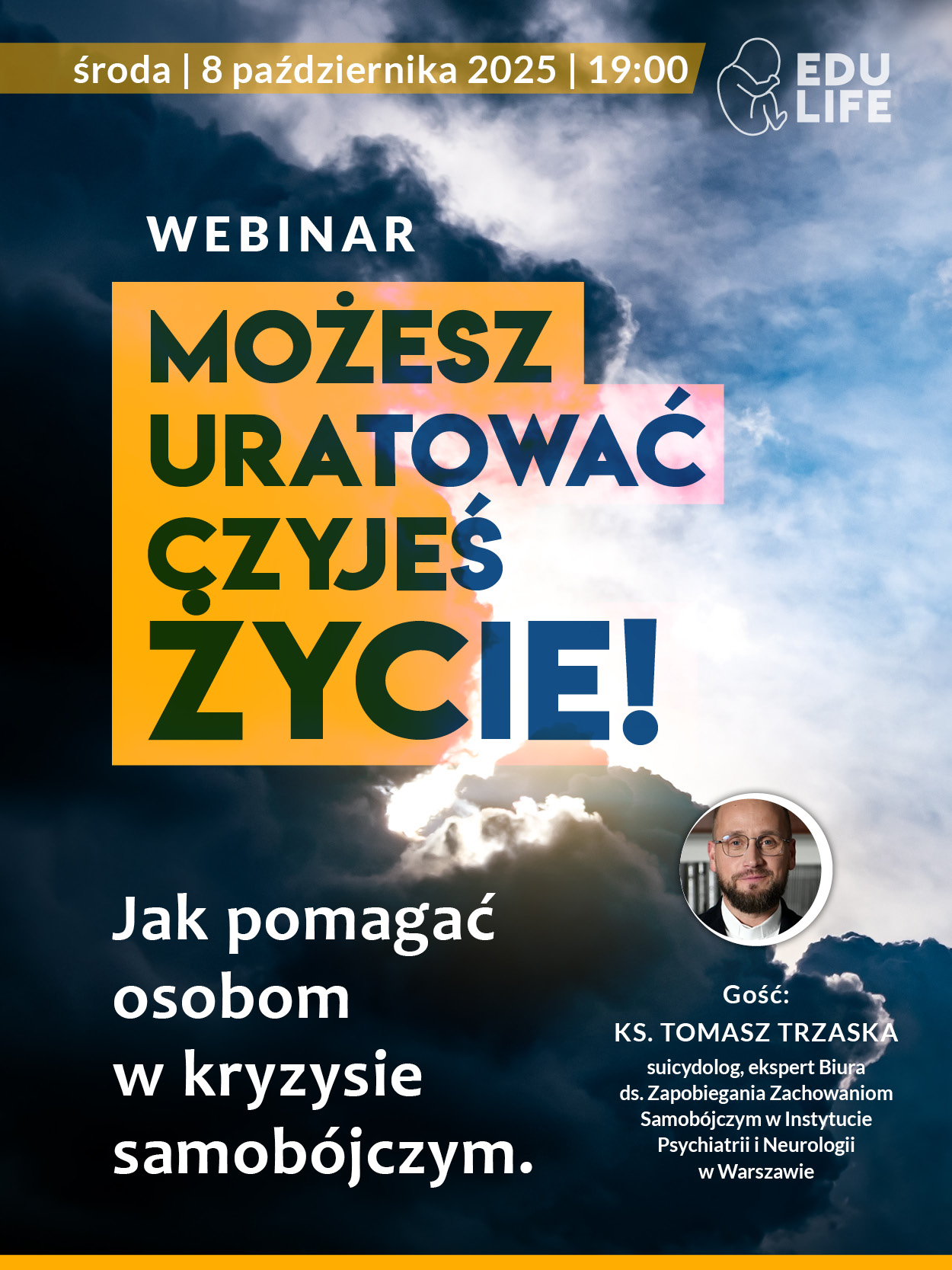 Webinar pt. „Możesz uratować czyjeś życie! Jak pomagać osobom w kryzysie samobójczym” jest kolejnym spotkaniem z cyklu EduLife, którego organizatorem jest Polskie Stowarzyszenie Obrońców Życia Człowieka. To cykl popularnonaukowych webinarów, które odbywają się raz w miesiącu od października do czerwca. Wykłady i rozmowy z zaproszonymi gośćmi są cenioną przez licznych odbiorców okazją do poszukiwania odpowiedzi na najtrudniejsze pytania m.in. o prawo do życia, rozwój dziecka w łonie matki, cele diagnostyki prenatalnej. Wszystkie nagrania webinarów są dostępne na kanale Polskiego Stowarzyszenia Obrońców Życia Człowieka na YouTube.