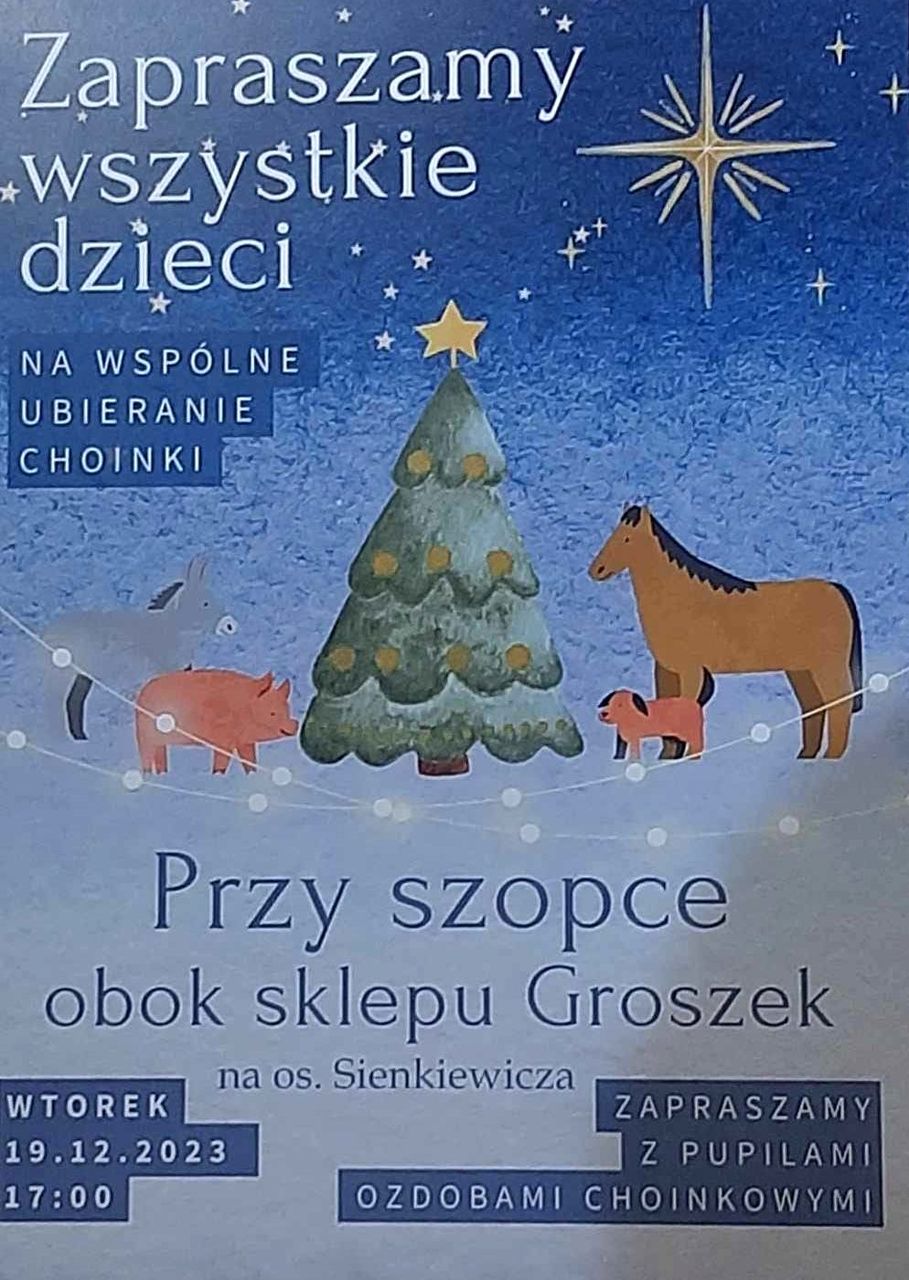 Tradycyjne spotkanie na osiedlu Sienkiewicza, podczas którego odbędzie się wspólne ubieranie choinki, rozpocznie się o godzinie 17.00. Miejsce spotkania jest to samo, co w poprzednich latach: przy sklepie Groszek. Każdy będzie mógł zawiesić na choince przyniesione przez siebie ozdoby. Pan Andrzej Zdrojewski zadba oczywiście o to, aby przy choince pojawiła się bożonarodzeniowa szopka.