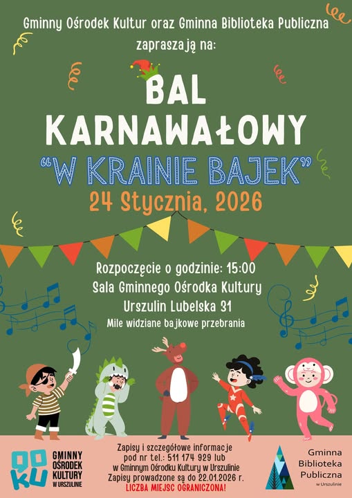 W sobotę, 24 stycznia, w Urszulinie odbędzie się bal karnawałowy dla dzieci – kolorowa zabawa pełna muzyki, tańca i radości.