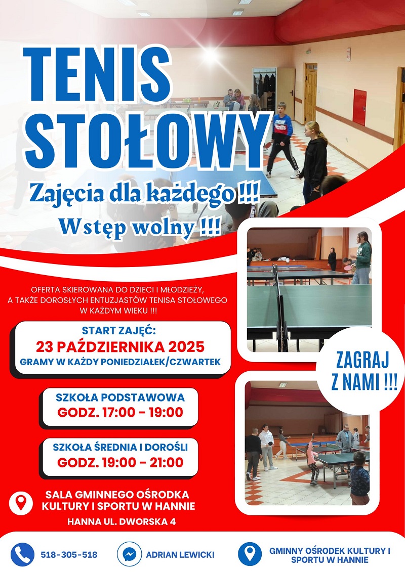 • Tenis stołowy – w każdy poniedziałek i czwartek.