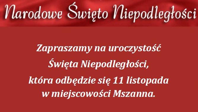 Gminne obchody Narodowego Święta Niepodległości w Gminie Olszanka odbędą się 11 listopada w miejscowości Mszanna. Rozpoczną się o godzinie 10.45 zbiórką na placu przed kościołem.