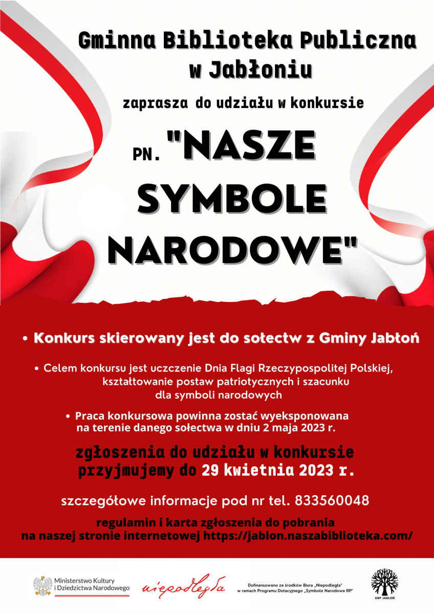 Gminna Biblioteka Publiczna w Jabłoniu zaprasza wszystkie sołectwa w gminie Jabłoń do wzięcia udziału w konkursie „NASZE SYMBOLE NARODOWE”. W ramach rywalizacji należy wykonać dekorację przedstawiającą symbol narodowy Rzeczpospolitej Polskiej.
