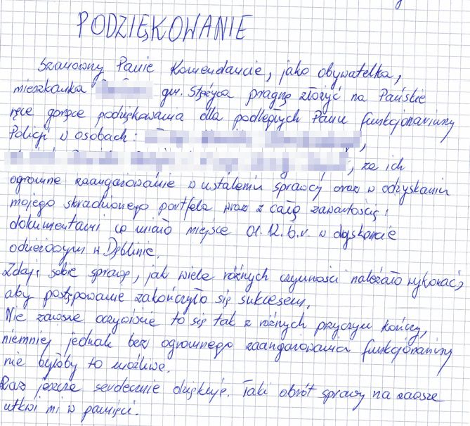 Do ryckiej komendy przyszedł list od mieszkanki gminy Stężyca, w którym dziękuje policjantom z dęblińskiego komisariatu „za ich ogromne zaangażowanie w ustaleniu sprawcy oraz w odzyskaniu mojego skradzionego portfela wraz z całą zawartością i dokumentami” . Kobieta napisała w nim, że „Zdaje sobie sprawę , jak wiele różnych czynności należało wykonać aby postępowanie zakończyło się sukcesem. Nie zawsze oczywiście to się tak z różnych przyczyn kończy niemniej jednak bez ogromnego zaangażowania funkcjonariuszy nie byłoby to możliwe. Raz jeszcze serdecznie dziękuję. Taki obrót sprawy na zawsze utkwi mi w pamięci.”Na początku grudnia br. w jednym ze sklepów w Dęblinie mieszkance gminy Stężyca wypadł portfel, który następnie został przywłaszczony przez inną klientkę. Pokrzywdzona powiadomiła o wszystkim Policję. Funkcjonariusze, którzy przyjechali na miejsce ustalili okoliczności zdarzenia. Dzięki zaangażowaniu dyżurnej oraz kryminalnych z dęblińskiego komisariatu jeszcze tego samego dnia ustalono sprawcę przywłaszczenia oraz zwrócono portfel właścicielce.