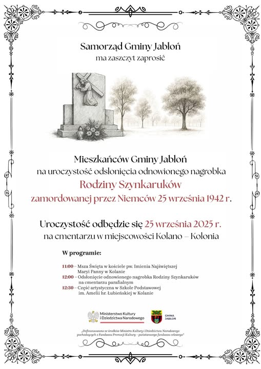 W czwartek, 25 września, Samorząd Gminy Jabłoń serdecznie zaprasza mieszkańców gminy na uroczystość odsłonięcia odnowionego nagrobka Rodziny Szynkaruków zamordowanej przez Niemców 25 września 1942 r. za pomoc udzieloną Żydom. Nagrobek, który znajduje się na cmentarzu parafialnym w miejscowości Kolano-Kolonia był bardzo zniszczony. Aby ocalić od zapomnienia tamte wydarzenia został odnowiony obelisk oraz znajdujące się na nim nieczytelne inskrypcje. Grób rodziny Państwa Szynkaruk na podstawie pisma z dn. 9 lutego 2023 r. został uznany przez Wojewodę Lubelskiego jako grób wojenny osób cywilnych, które straciły życie wskutek represji okupanta niemieckiego oraz został wpisany do ewidencji grobów i cmentarzy wojennych prowadzonej przez Wojewodę Lubelskiego. Całe wydarzenie zostanie poprzedzone uroczystą Mszą Świętą o godz. 11.00 w kościele Imienia Najświętszej Maryi Panny w Kolanie, a zakończy je nietypowa lekcja historii w postaci części artystycznej w Szkole Podstawowej im. Amelii hr Łubieńskiej w Kolanie.Zadanie jest zrealizowane dzięki, dofinansowaniu przyznanemu w ramach Programu Groby i cmentarze wojenne w kraju - infrastruktura 2025 ze środków Ministerstwa Kultury i Dziedzictwa Narodowego.