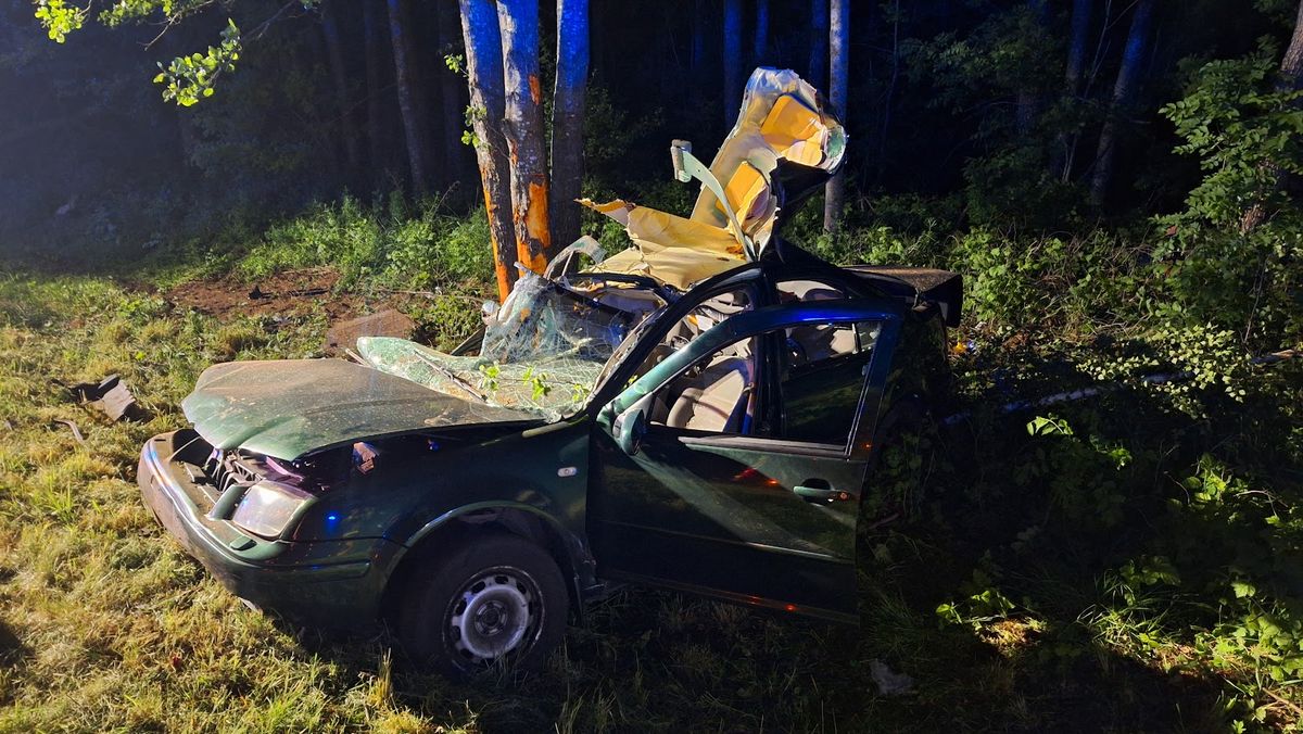W wyniku uderzenia w drzewo samochód osobowy wypadł z drogi i zatrzymał się w rowie — strażacy, którzy dotarli na miejsce jako pierwsi, ewakuowali kierowcę z uszkodzonego pojazdu i udzielili mu pomocy.