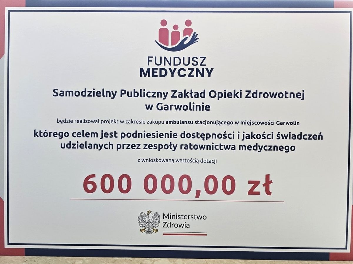 Ministerstwo Zdrowia pozytywnie rozpatrzyło złożony przez Samodzielny Publiczny Zakład Opieki Zdrowotnej w Garwolinie wniosek na wsparcie infrastruktury ratownictwa medycznego w zakresie zakupu ambulansów dla zespołów ratownictwa medycznego wraz z dodatkowym wyposażeniem ze środków subfunduszu modernizacji podmiotów leczniczych wyodrębnionego z funduszu medycznego. Wartość dofinansowania: 600 000,00 zł.W ramach dofinansowania zostanie zakupiony nowy ambulans sanitarny wraz z wideolaryngoskopem, urządzeniem do bezpiecznego oczyszczania powietrza wbudowanym w pojazd lub umożliwiające montaż w pojeździe, urządzeniem do przenoszenia pacjenta siedzącego o nośności co najmniej 170 kg z systemem trakcyjnym umożliwiającym zsuwanie pacjenta po schodach, noszami z systemem elektrycznego wspomagania podnoszenia, opuszczania oraz załadunku noszy.