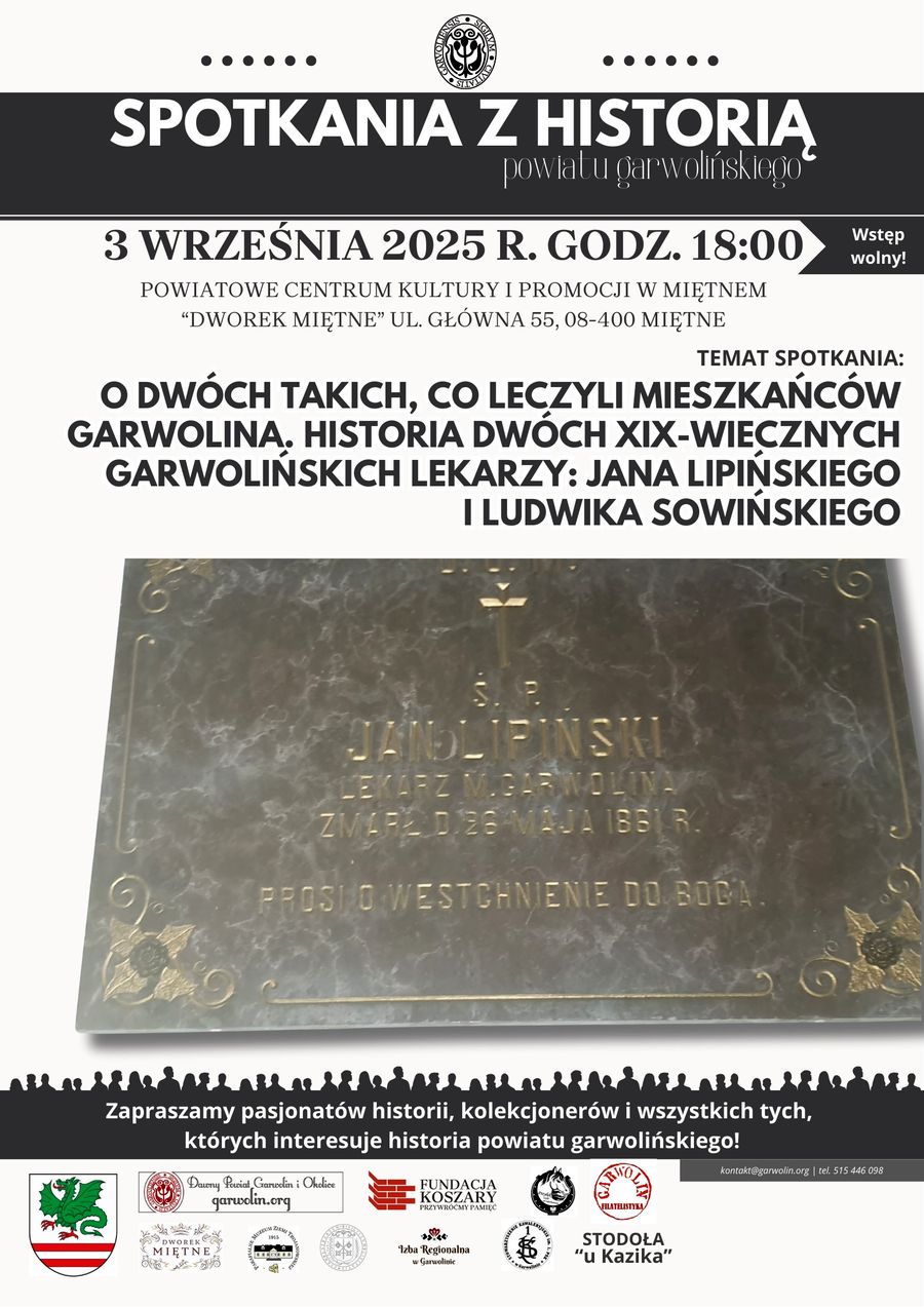 Organizatorzy zapraszają pasjonatów historii, kolekcjonerów i wszystkich tych, których interesuje historia powiatu garwolińskiego na pierwsze powakacyjne spotkanie pt. „O dwóch takich, co leczyli mieszkańców Garwolina, czyli historia XIX-wiecznych lekarzy Jana Lipińskiego i Ludwika Sowińskiego”. Zaprezentowane zostaną na nim nowe materiały o obu postaciach. - Jaka tajemnica kryje się za pamiątkową tablicą umieszczoną w kruchcie garwolińskiej kolegiaty? Kto postawił metalowy cokół na grobie doktora Sowińskiego? Odpowiedzi na te pytanie będziemy poszukiwać na spotkaniu – zapewniają organizatorzy. Zapowiadają też, że będzie ciekawie.Pierwsze po wakacjach spotkanie z historią już w środę, 3 września w Dworku w Miętnem. Początek godzina 18:00. Wstęp wolny.