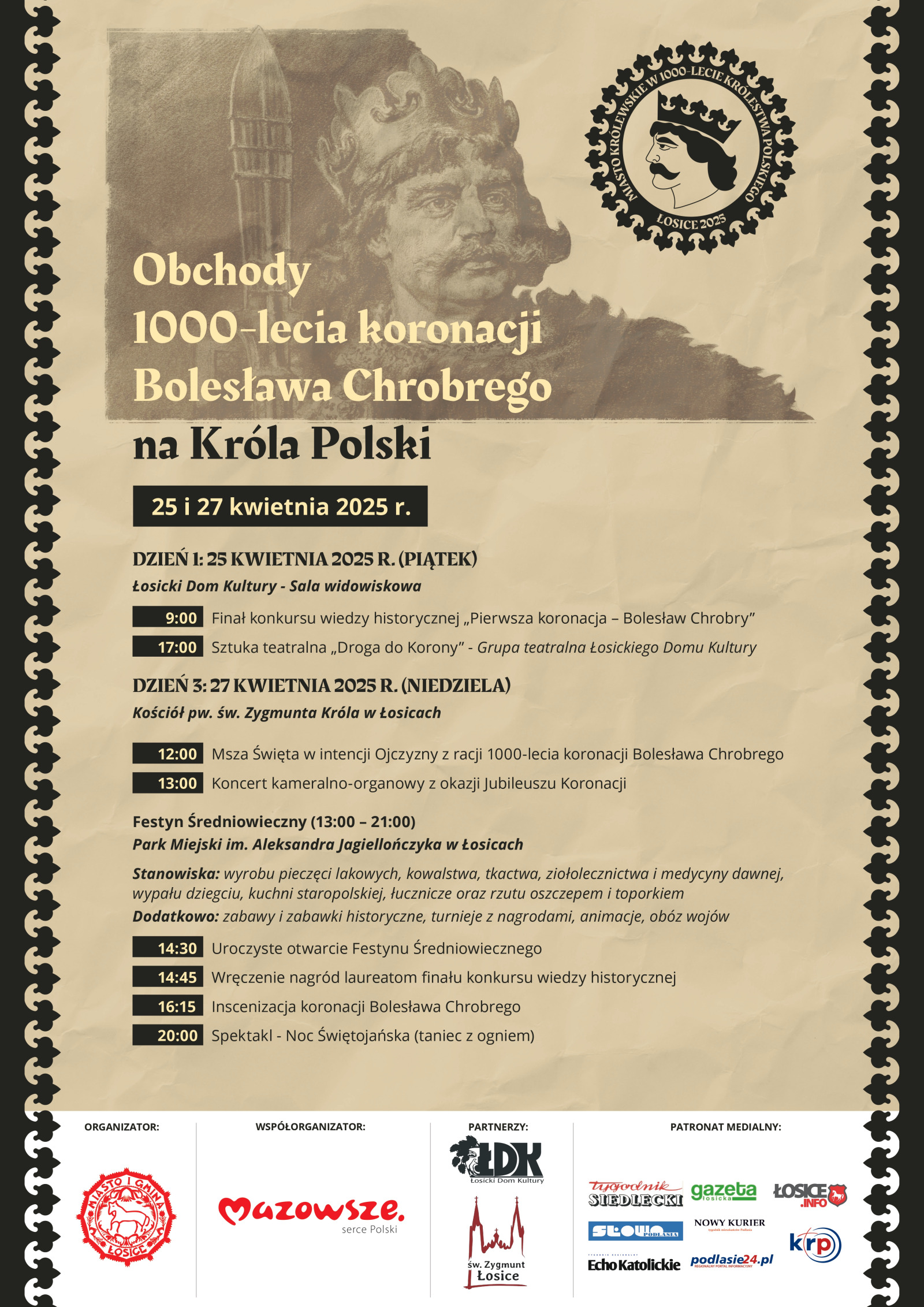 W Łosicach zaplanowano obchody 1000-lecia koronacji Bolesława Chrobrego na Króla Polski. W związku z uroczystościami pogrzebowymi papieża Franciszka oraz ogłoszoną przez Prezydenta RP żałobą narodową na dzień 26 kwietnia, zmianie uległ harmonogram wydarzenia.