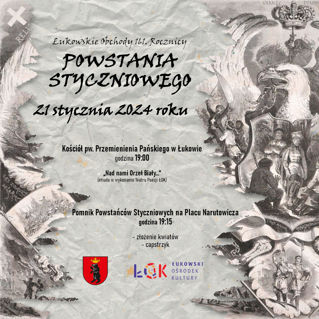 Powstanie Styczniowe było największym polskim powstaniem narodowym. Skierowane było przeciwko Imperium Rosyjskiemu. Zostało ogłoszone Manifestem 22 stycznia 1863 roku, wydanym w Warszawie przez Tymczasowy Rząd Narodowy. Wybuchło 22 stycznia 1863 roku w Królestwie Polskim i 1 lutego 1863 roku na Litwie. Trwało do jesieni 1864 roku. Miało ono charakter wojny partyzanckiej, w której stoczono około 1200 bitew i potyczek. Przez oddziały powstania styczniowego przewinęło się około 200 tysięcy ludzi. Mimo początkowych sukcesów zakończyło się klęską powstańców, z których kilkadziesiąt tysięcy zostało zabitych w walkach, blisko tysiąc straconych, około 38 tysięcy skazanych na katorgę lub zesłanych na Syberię, a około 10 tysięcy wyemigrowało. Zdarzały się przypadki, że Rosjanie zabijali pojmanych powstańców, dobijali rannych, mordowali lekarzy spieszących im z pomocą, obdzierali do naga zabitych. Po bitwach Rosjanie palili miejscowości, które udzieliły schronienia powstańcom, dokonywali rzezi ludności cywilnej. Niszczono dobra kultury. Przypominamy, że wielu młodych łukowian zaciągnęło się do oddziałów powstańczych, które na początku toczyły z zaborcą rosyjskim duże bitwy, rzucając do walk setki, a nawet tysiące ludzi.Miejskie obchody 161. rocznicy wybuchu Powstania Styczniowego organizują władze Łukowa oraz Łukowski Ośrodek Kultury. Odbędą się one w niedzielę, 21 stycznia. Rozpoczną się o godzinie 19.00. W kościele Przemienienia Pańskiego wystąpią recytatorzy z Teatru Poezji ŁOK. Zaprezentują oni etiudę pod tytułem „Nad nami Orzeł Biały...”. Usłyszymy fragmenty pieśni i wierszy powstańczych z 1864 roku. Następnie uczestnicy uroczystości złożą kwiaty pod pomnikiem Powstańców Łukowian na Placu Narutowicza.