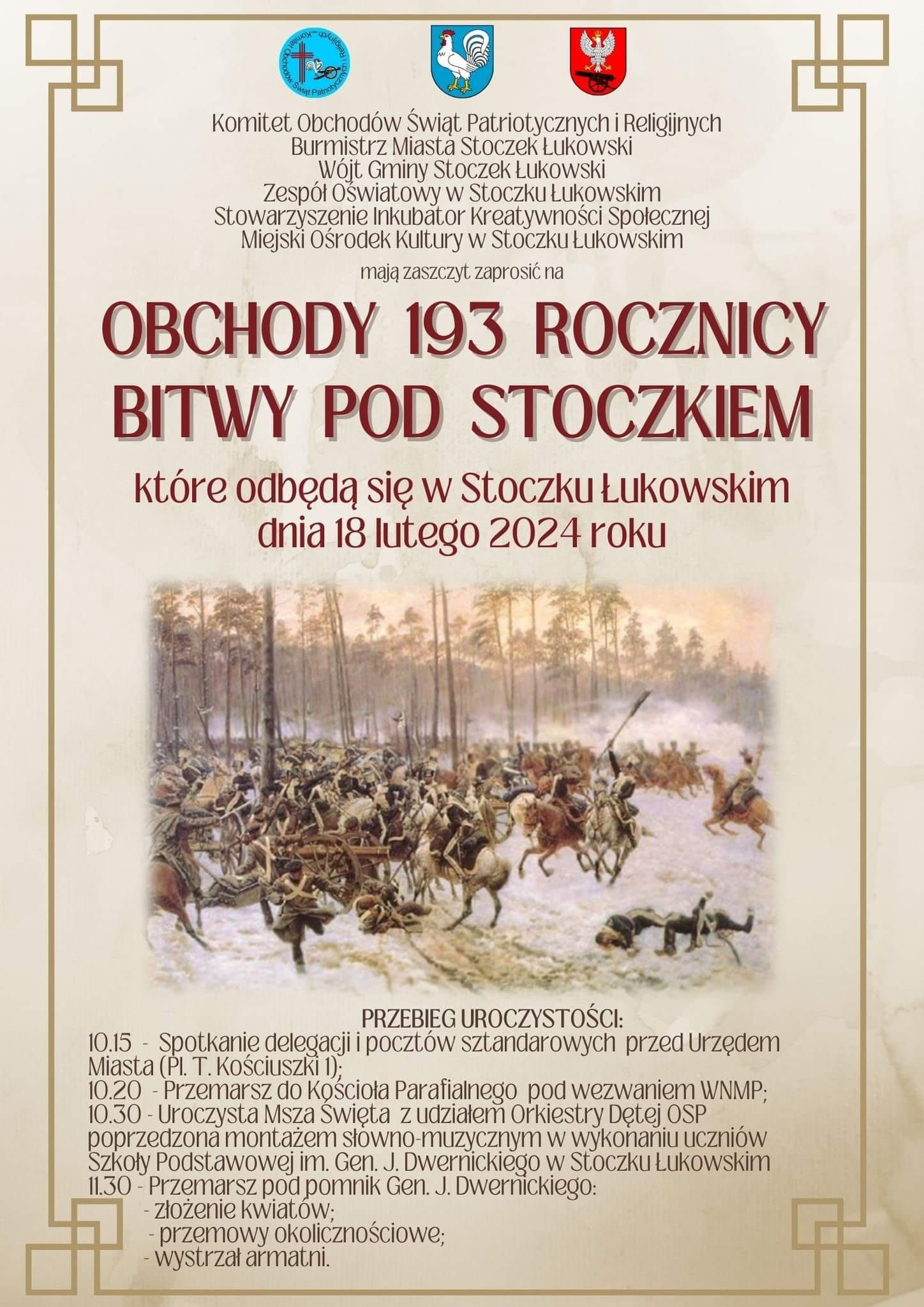 Program obchodów:10:15 - spotkanie delegacji i pocztów sztandarowych przed Urzędem Miasta w Stoczku Łukowskim,