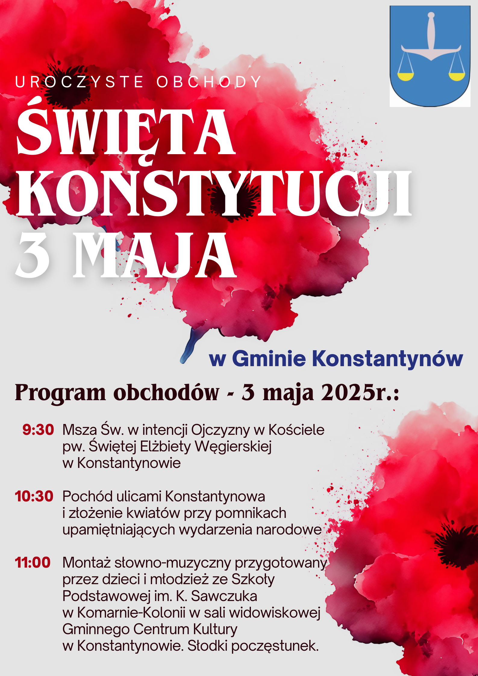 O godzinie 12:00 w sali widowiskowej w Konstantynowie odbędzie się montaż słowno-muzyczny przygotowany przez uczniów Szkoły Podstawowej w Komarnie-Kolonii. Zwieńczeniem obchodów będzie słodki poczęstunek dla uczestników.Zapraszamy do udziału w obchodach, które będą okazją do wspólnego uczczenia rocznicy uchwalenia Konstytucji 3 Maja.