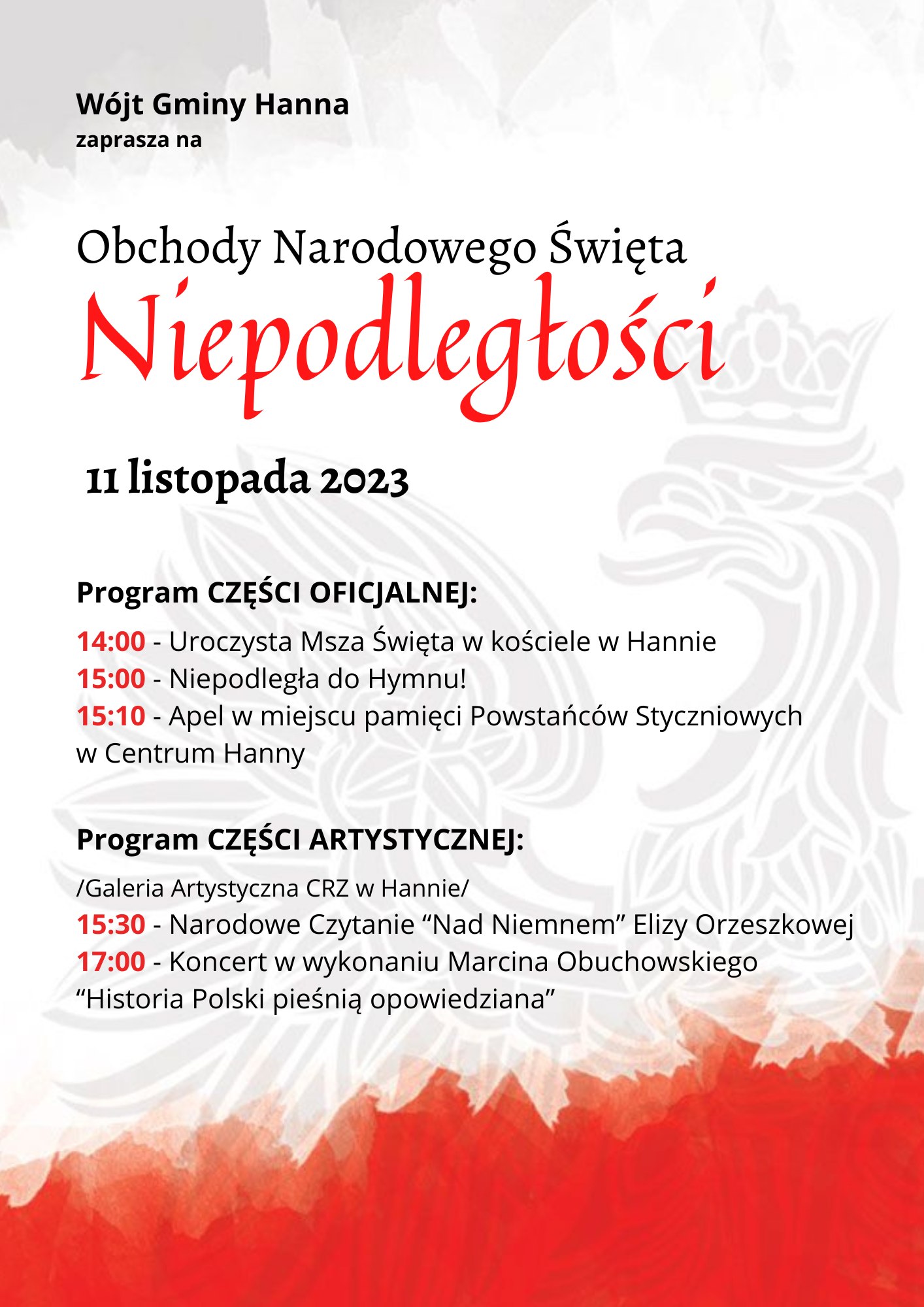 Uroczysta Msza św. sprawowana o godz. 14.00 rozpocznie obchody Narodowego Święta Niepodległości w Gminie Hanna. Po Eucharystii zostanie odśpiewany Hymn Narodowy, a następnie odbędzie się apel w miejscu pamięci Powstańców Styczniowych.