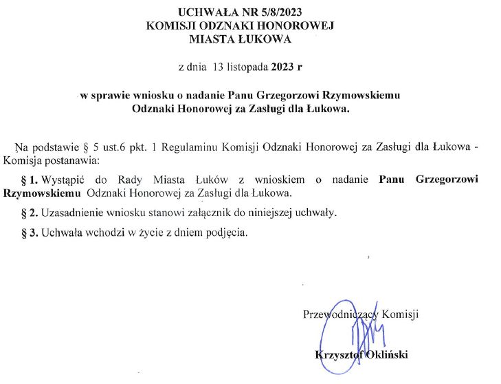 Uzasadnienie do przyznania Odznaki Honorowej za Zasługi dla Łukowa Grzegorzowi Rzymowskiemu: