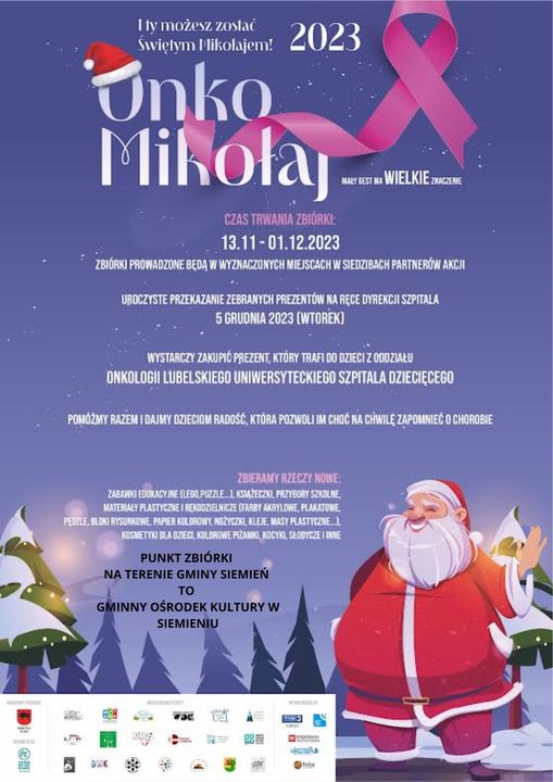 - W tym roku zaangażowaliśmy się w akcję społeczną „Onko Mikołaj”, którego głównym organizatorem jest Centrum Kultury w Łęcznej, ale w działanie zaangażowały się licznie ośrodki kultury z terenu województwa lubelskiego. Cel akcji jest bardzo szczytny, bo zbieramy na dzieci z oddziału onkologii Lubelskiego Uniwersyteckiego Szpitala Dziecięcego w Lublinie, które naprawdę potrzebują naszej pomocy. Dlatego zachęcamy wszystkich, aby włączyli się w zbiórkę przynosząc do Gminnego Ośrodka Kultury w Siemieniu materiały plastyczne, kocyki, kosmetyki dla dzieci, czyli wszystko to, co sprawi dzieciom radość na oddziale, aby święta te były piękne chociaż przez chwilę - informuje Katarzyna Kowalczyk, dyrektor Gminnego Ośrodka Kultury w Siemieniu.Podczas zbiórki, która trwa od 13 listopada do 1 grudnia 2023 r., zbierane są rzeczy nowe. Uroczyste przekazanie zebranych prezentów na ręce dyrekcji szpitala odbędzie się we wtorek 5 grudnia br.