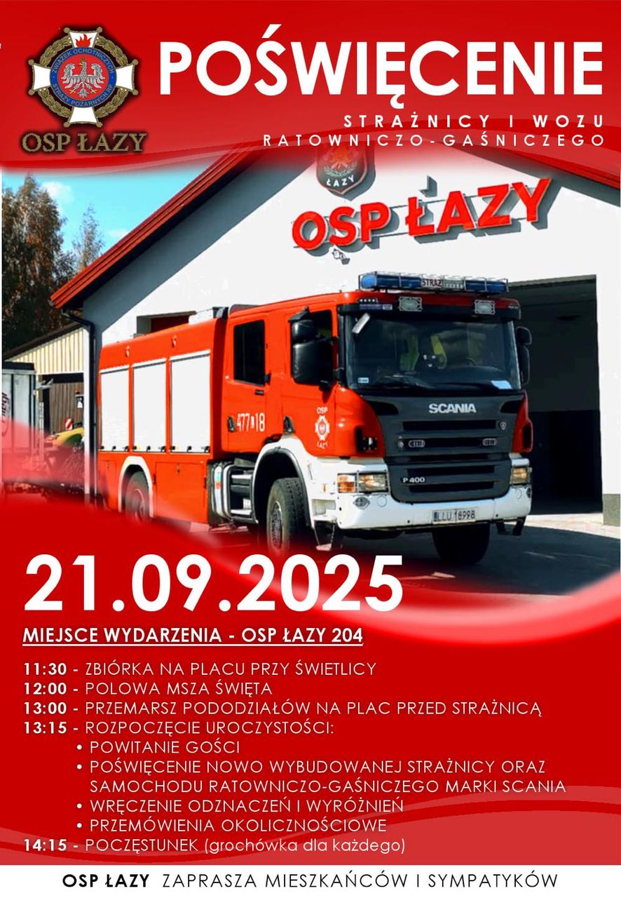 Uroczystość zaplanowana przez strażaków ochotników rozpocznie się o godzinie 11:30 zbiórką na placu przy świetlicy. O godzinie 12:00 rozpocznie się Msza Święta polowa. Następnie druhowie przemaszerują przed strażnicę, która zostanie poświęcona. Zaplanowano również poświęcenie samochodu ratowniczo-gaśniczego marki Scania, który jest na wyposażeniu druhów z OSP Łazy.Spotkanie organizowane przez OSP Łazy zakończy wspólny piknik i poczęstunek dla gości.