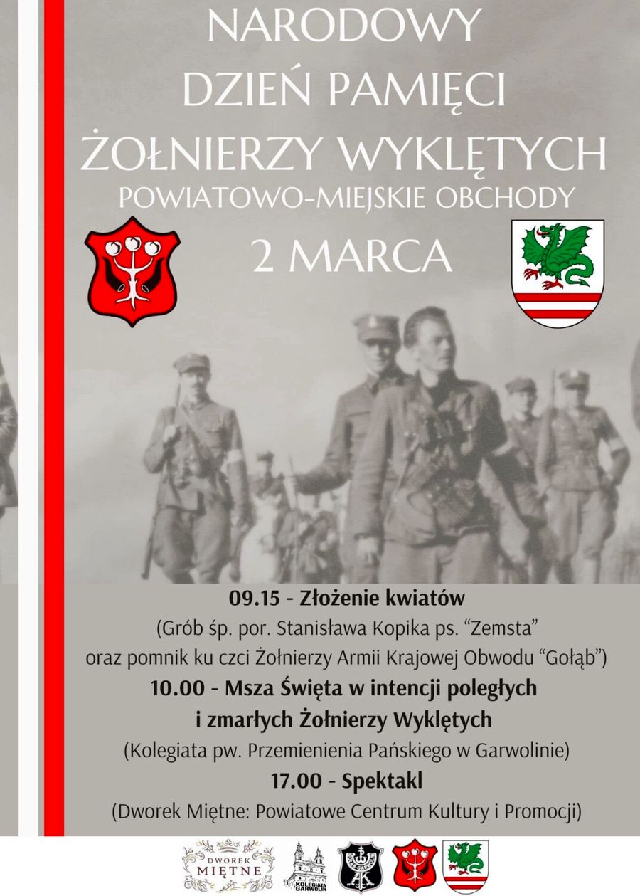 O godz. 09:15 delegacje złożą kwiaty i zapalą znicze na grobie por. Stanisława Kopika ps. „Zemsta” – żołnierza 1. Pułku Strzelców Konnych, oficera Wojska Polskiego, Armii Krajowej i Narodowych Sił Zbrojnych VII Okręgu Śląskiego. Po 74 latach, pochowany niegdyś pod fałszywym nazwiskiem oficer Wojska Polskiego, 10 października 2022 r. spoczął na garwolińskim cmentarzu parafialnym. Następnie złożone zostaną wiązanki kwiatów pod pomnikiem upamiętniającym Żołnierzy AK i Żołnierzy Wyklętych na skwerze im. Lecha Kaczyńskiego.O godz. 10:00 w kolegiacie pw. Przemienienia Pańskiego zostanie odprawiona msza święta w intencji poległych i zmarłych Żołnierzy Wyklętych, a o 17:00 w Powiatowym Centrum Kultury i Promocji w Miętnem odbędzie się spektakl w hołdzie Żołnierzom Wyklętym.