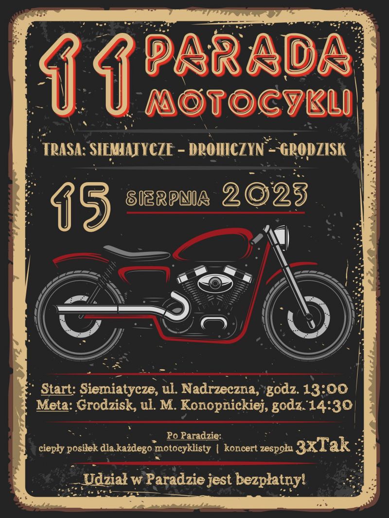 11. Parada Motocykli rozpocznie się w Siemiatyczach przy ul. Nadrzecznej. O 12.45 zaplanowano przemówienia zaproszonych gości oraz ogłoszenia organizacyjne, o godzinie 13.00 start parady. Finał w Grodzisku około 14.10. Łącznie motocykliści przejadą trasę o długości 41,5 km.Organizatorami parady są samorządy Drohiczyna, Grodziska i Siemiatycz.