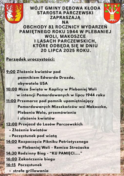 O tym, jak ważna jest pamięć o historii i tych, którzy zginęli za wolność naszej ojczyzny przekonają się uczestnicy spotkania organizowanego w gminie Dębowa Kłoda w niedzielę, 20 lipca. Dopełnieniem wydarzenia będzie „Rodzinny bieg ku pamięci”, który odbędzie się w miejscowości Plebania Wola.