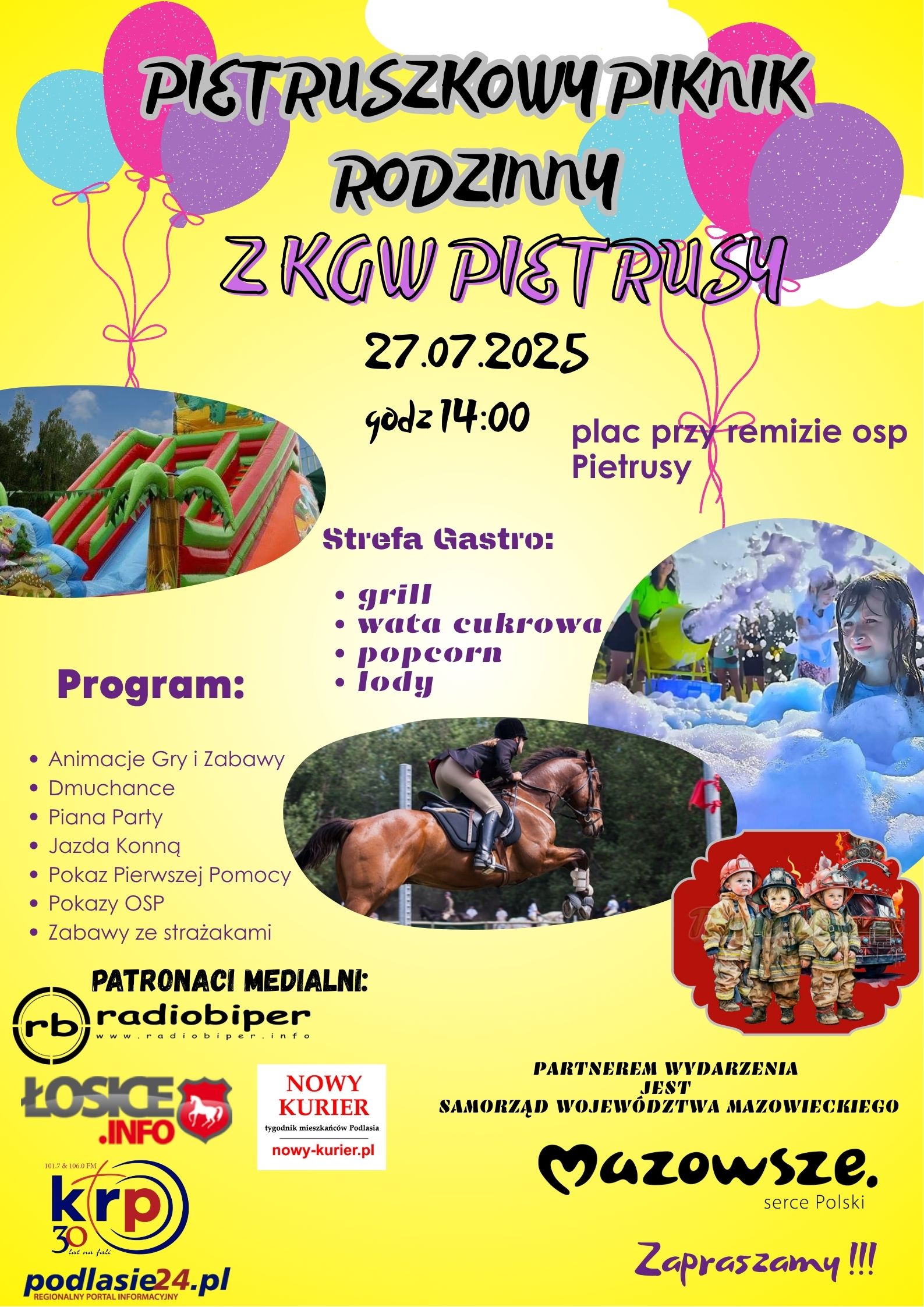 Impreza rozpocznie się o godzinie 14:00. - Będzie wiele atrakcji dla dzieci i dorosłych m.in. dmuchańce, jazda konna, pokaz pierwszej pomocy, animacje, gry i zabawy - mówi Przewodnicząca Koła Gospodyń Wiejskich w Pietrusach Marlena Radzikowska.Patronat medialny nad tym wydarzeniem sprawuje KRP i portal regionalny podlasie24.pl