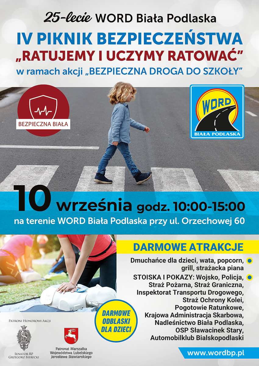 10 września, już od godz. 10.00 na terenie Wojewódzkiego Ośrodka Ruchu Drogowego w Białej Podlaskiej rozpocznie się Piknik Bezpieczeństwa "Ratujemy i uczymy ratować". W tym roku Piknik został również połączony z trzecią edycją akcji, organizowanej przez bialski WORD pn. "Bezpieczna droga do szkoły". Oba wydarzenia odbędą się w ramach 25-rocznicy powstania ośrodka. Wydarzenie potrwa w godzinach 10.00 -15.00.Celem pikniku jest kształtowanie i propagowanie właściwych podstaw z zakresu bezpieczeństwa, zarówno u dzieci, jak i dorosłych. Na stałe wpisał się już w kalendarz wydarzeń miejskich.