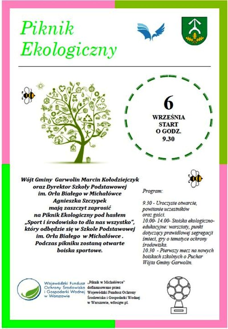 Wójt gminy Garwolin Marcin Kołodziejczyk i dyrektor szkoły Szkoły Podstawowej im.Orła Białego w Michałówce Agnieszka Szczypek zapraszają na Piknik Ekologiczny po hasłem „Sport i środowisko to dla nas wszystko”. Podczas pikniku zostaną otwarte boiska sportowe.