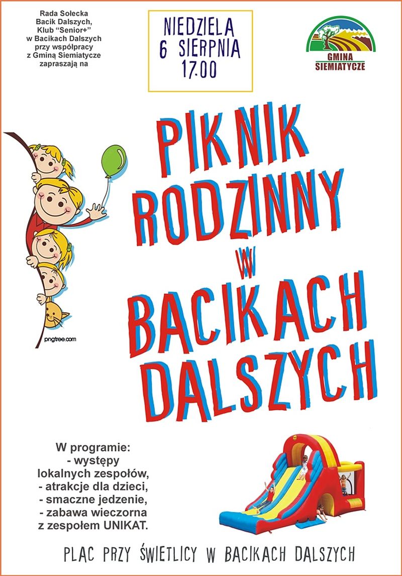 Na Piknik Rodzinny zapraszają: Rada Sołecka Bacik Dalszych, Klub „Senior+” w Bacikach Dalszych i Gmina Siemiatycze.Piknik odbędzie się w niedzielę, 6 sierpnia o godz. 17.00.