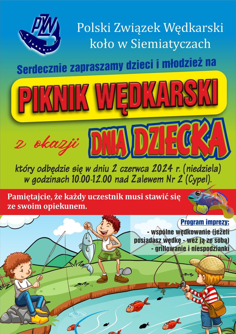 Polski Związek Wędkarski Koło w Siemiatyczach zaprasza dzieci i młodzież na Piknik Wędkarski z okazji Dnia Dziecka.