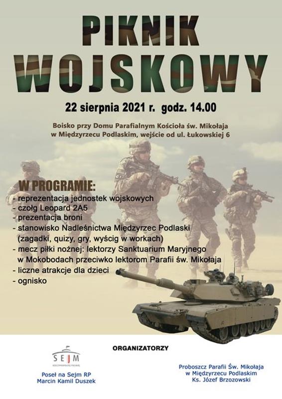Będzie wiele atrakcji nie tylko dla dzieci m.in. na parkingu parafialnym przy ul. Łukowskiej pojawi się czołg Leopard a na boisku przy plebanii św. Mikołaja zostanie rozegrany mecz piłki nożnej pomiędzy lektorami z parafii św. Mikołaja i parafii Mokobody.Piknik wojskowy organizuje ks. kanonik Józef Brzozowski wspólnie z posłem Marcinem Duszkiem.