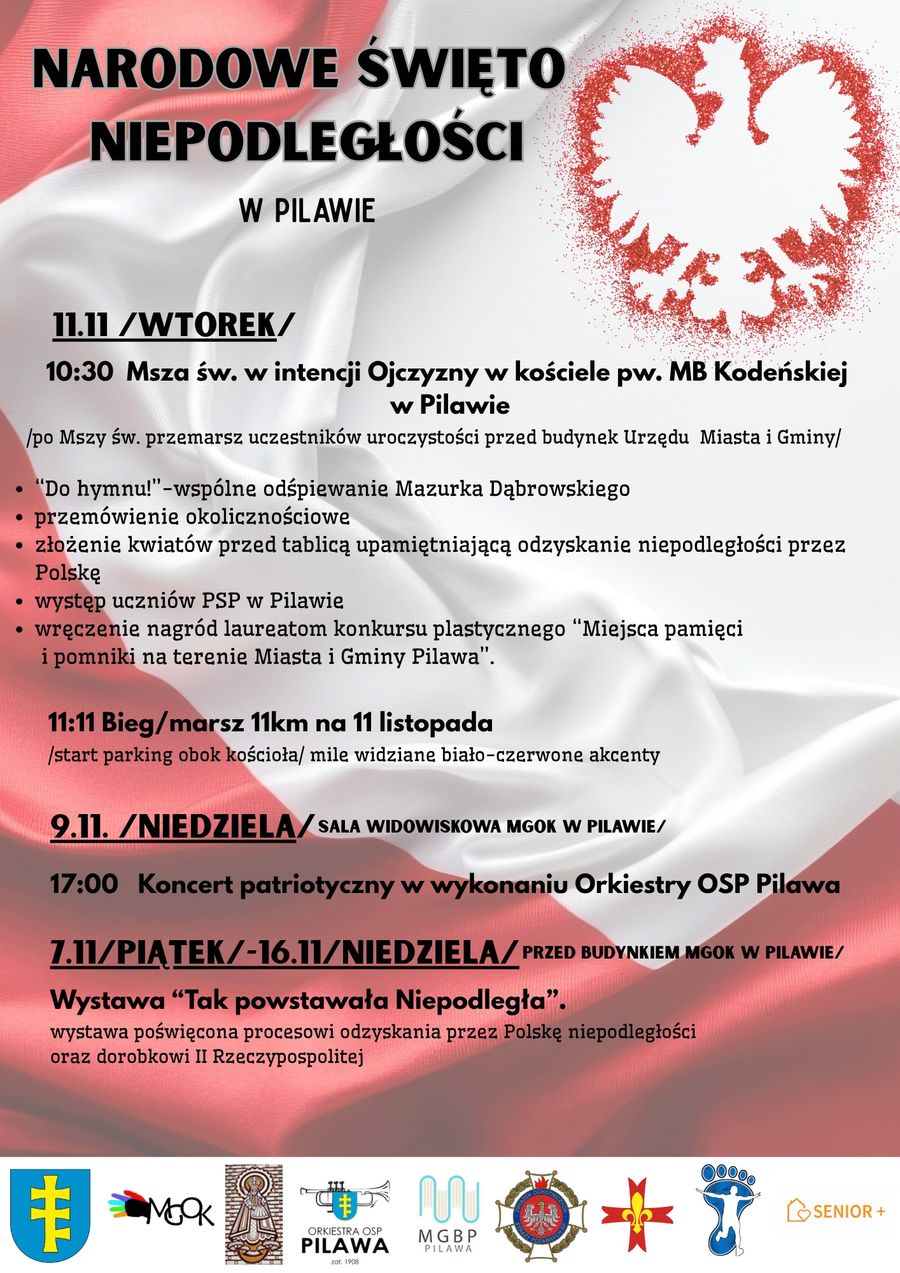 Obchody poprzedzi koncert patriotyczny Orkiestry Dętej OSP z Pilawy, który odbędzie się 9 listopada o godz. 17:00 w sali widowiskowej Miejsko–Gminnego Ośrodka Kultury. To muzyczna podróż przez dzieje Polski – pełna wzruszeń, refleksji i dumy narodowej.