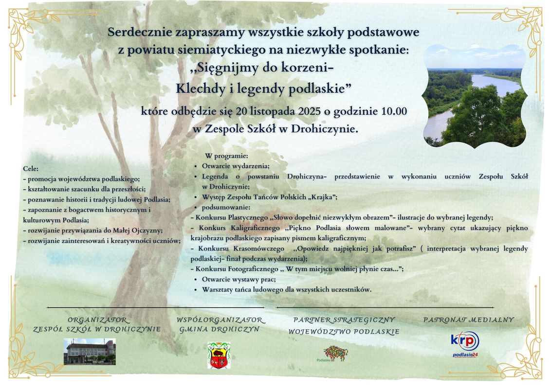 Projekt „Sięgnijmy do korzeni – klechdy i legendy podlaskie”, realizowany przez Zespół Szkół w Drohiczynie i Gminę Drohiczyn, objęty jest patronatem medialnym Katolickiego Radia Podlasie i portalu podlasie24.pl.
