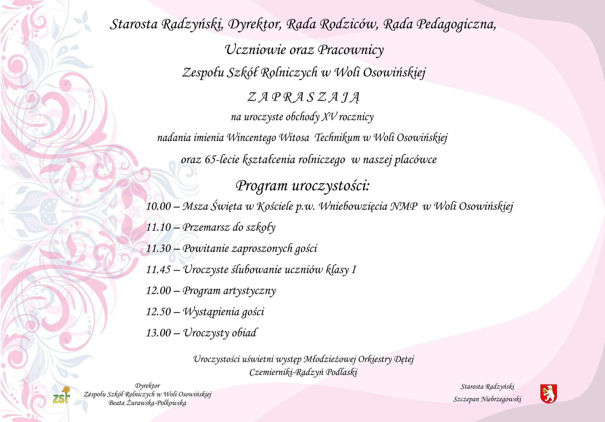 Obchody obu jubileuszy rozpoczną się o godzinie 12:00 Mszą Świętą w miejscowym kościele. W programie zaplanowano m.in. wystąpienia zaproszonych gości, ślubowanie uczniów klasy I Technikum Przetwórstwa Mleczarskiego oraz część artystyczną, podczas której uczniowie przybliżą patrona szkoły Wincentego Witosa.- Wydarzenie będzie też okazją do spotkania wielu pokoleń uczniów, nauczycieli oraz przyjaciół szkoły – mówi Beata Żurawska-Polkowska, dyrektor Zespołu Szkół Rolniczych w Woli Osowińskiej.