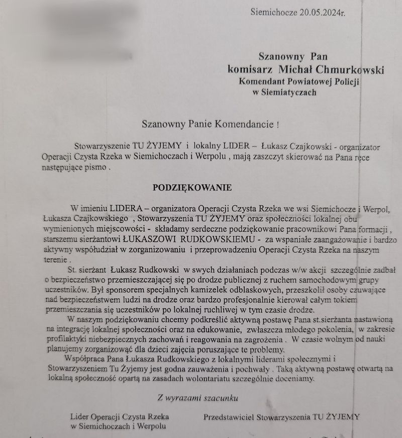 Na ręce Komendanta Powiatowego Policji w Siemiatyczach wpłynęło podziękowanie od organizatorów Operacji Czysta Rzeka we wsi Siemichocze i Werpol, dla dzielnicowego starszego sierżanta Łukasza Rudkowskiego, który pomagał w zorganizowaniu tej inicjatywy.