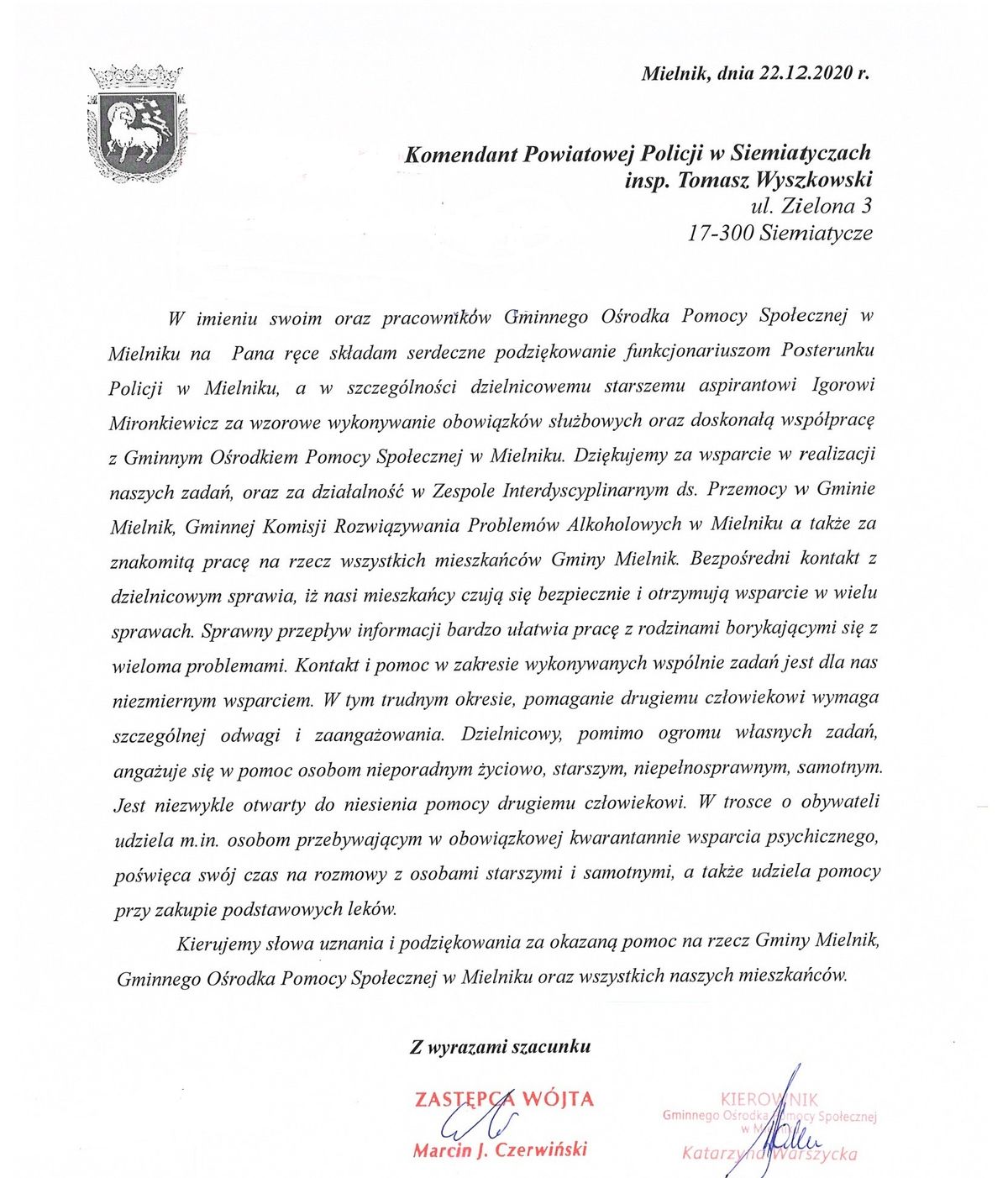 Na ręce Komendanta Powiatowego Policji w Siemiatyczach przełamanie przełożenia wójta gminy Mielnik i pracowników Gminnego Ośrodka Pomocy Społecznej, którzy pracowali i dzielnicowego Igora Mironkiewicza. To wyróżnienie za wzorową służbę na rzecz osób nieporadnych życiowo, starsze, niepełnosprawne, samotnych. W okresie zimowym policjanci ze specyficznej intensywności odwiedzają takie osoby sprawdzając czy nie pomoc. Jednym z takich samotności jest jeden z mieszkańców gminy Mielnik, który mieszkanie i ma problemy z samodzielnym poruszaniem się. Starszy aspirant Igor Mironkiewicz niemal codziennie odwiedza mężczyznę, dowozi mu potrzebne artykuły spożywcze czy też przygotowuje się na opał.